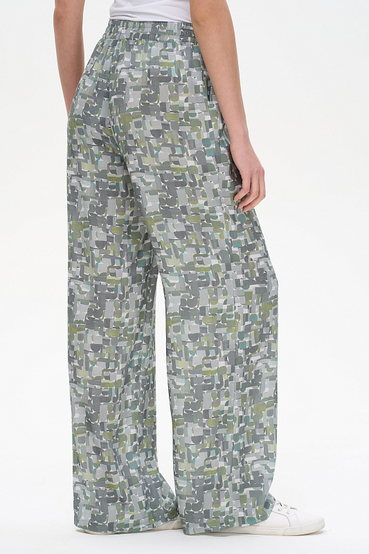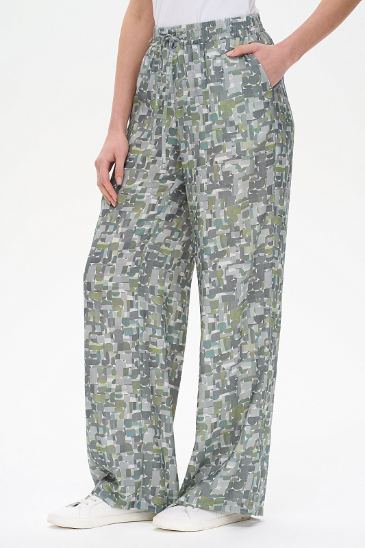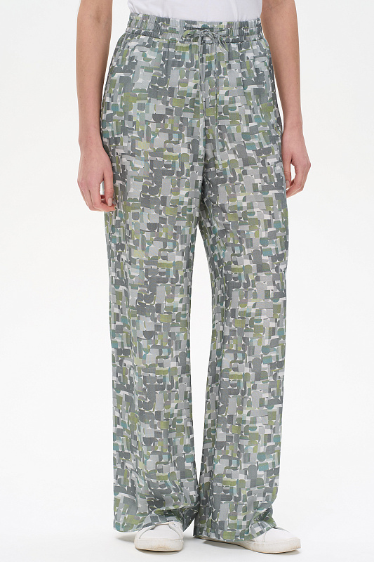 Прямые свободные брюки полной длины из штапельной вискозной ткани 120 гр. Графичный рисунок в серо-зелёных оттенках Классические карманы в боковом шве, пояс с эластичной лентой внутри, завязки для регулировки посадки. Комфортная, лёгкая модель на жаркие дни. В комплекте с рубашкой из той же ткани создается идеальное сочетание комфорта и элегантности. Рост модели 175 см.