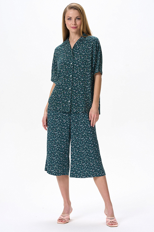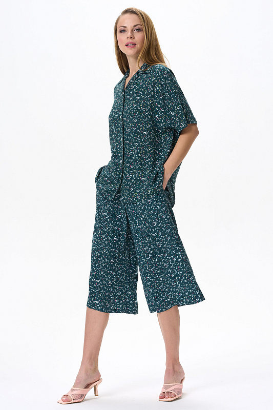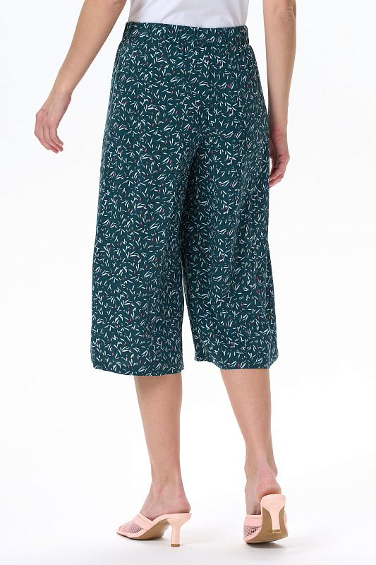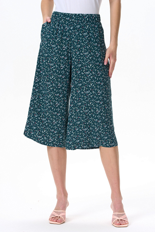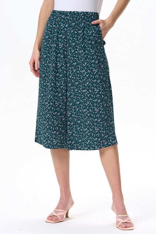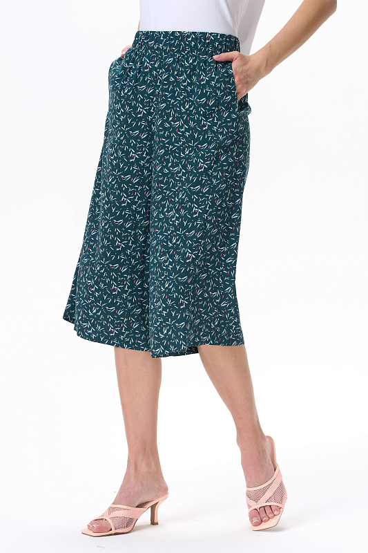 Модные брюки из штапеля 100 гр - штрихи на изумрудном оттенке. Благодаря конструкции и объему модель выглядит как юбка. Длина изделия до середины икр, пояс с эластичной лентой внутри, карманы в боковом шве. Стильные свободные летние брюки-кюлоты - отличный вариант для офиса, города, прогулок. Выглядят как женственная юбка, но при этом обеспечивают свободу движений. Рост модели 175 см.
