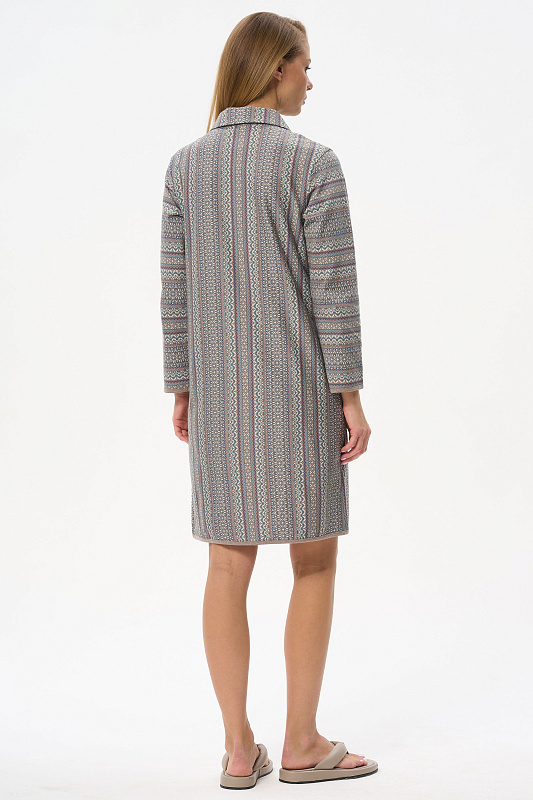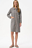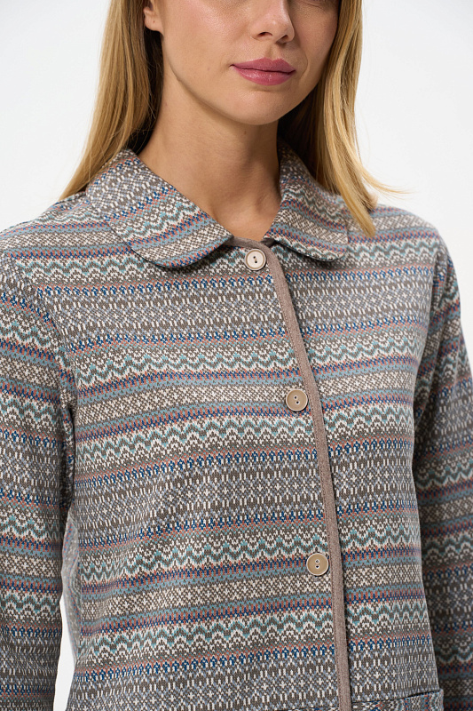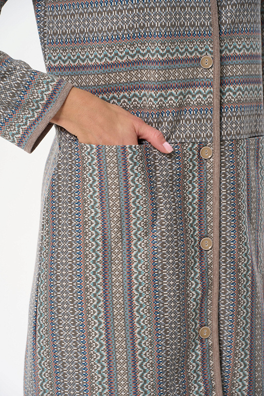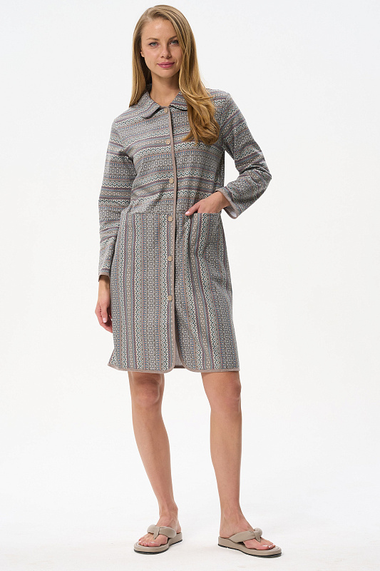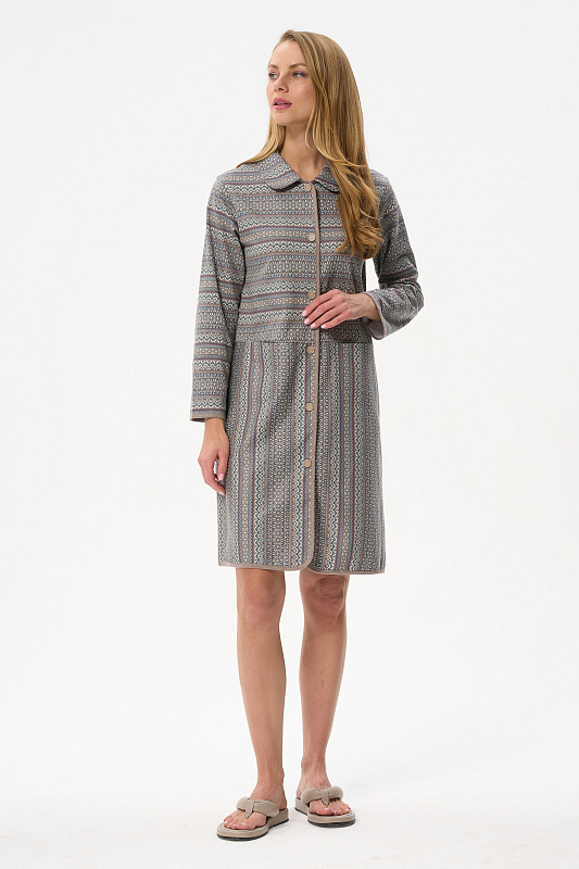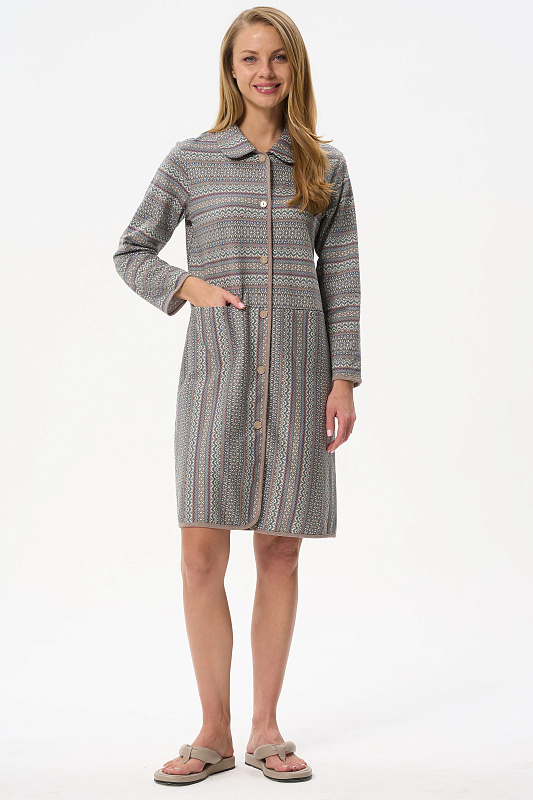 Уютный халат из хлопкового футера 2х нитки с начесом. Отложной воротник, центральная застежка на пуговицы, В подрезах полочки карманы. Длинные втачные рукава. Длина изделия чуть ниже колена. Рост модели на фото 178 см.