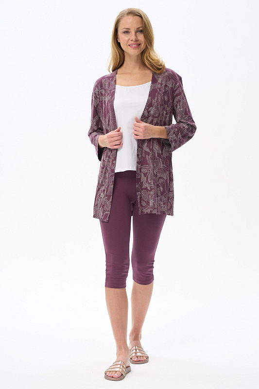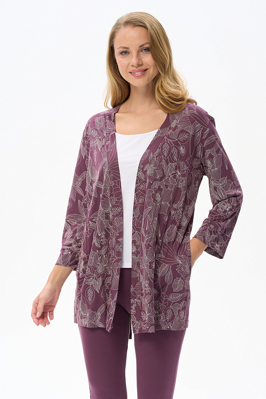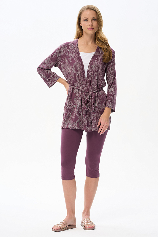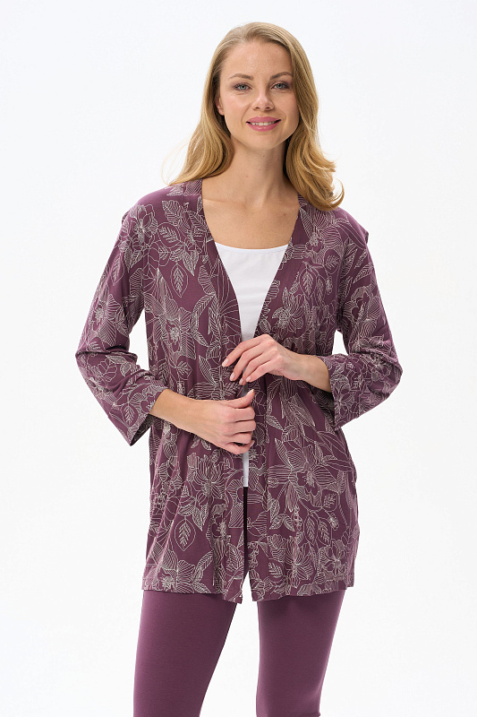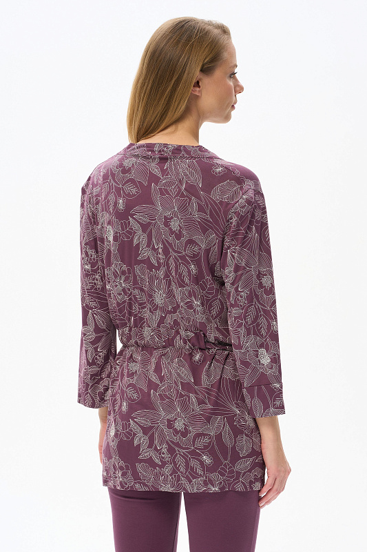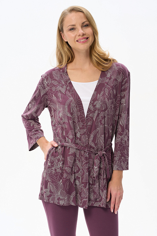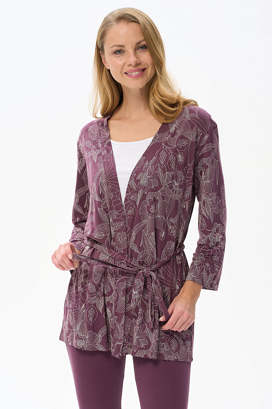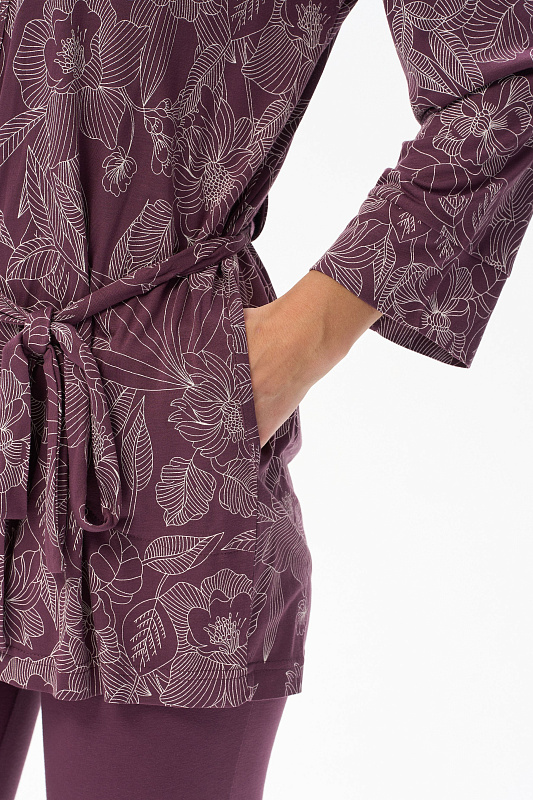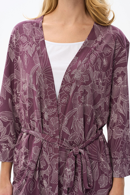 Короткий халат на запах с поясом. Выполнен из вискозного полотна. Длинные рукава с манжетами, в боковых швах карманы. Длина изделия до середины бедра. Рост модели на фото 177.