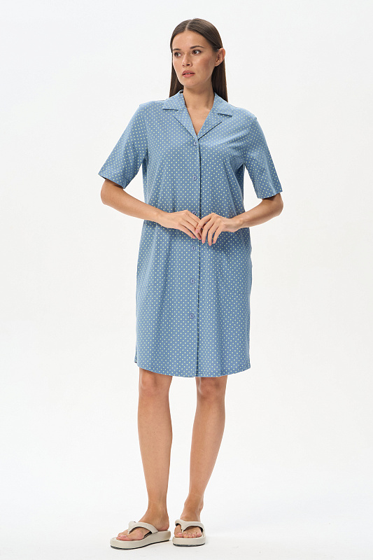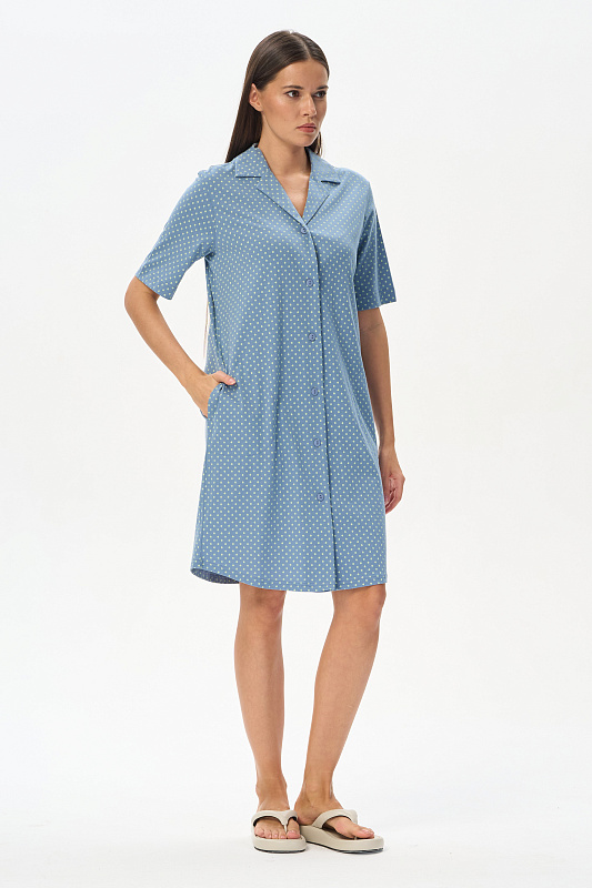 Класический халат приталенного силуэта из хлопкового полотна. Отложной воротник с лацканами, застежка на пуговицы, Карманы в боковых швах. Фигурная линия низа. Рост модели на фото 175см.