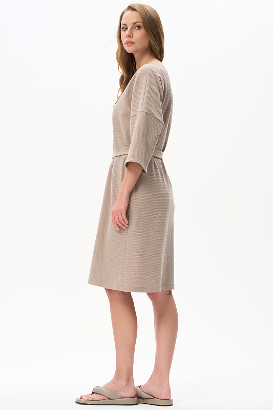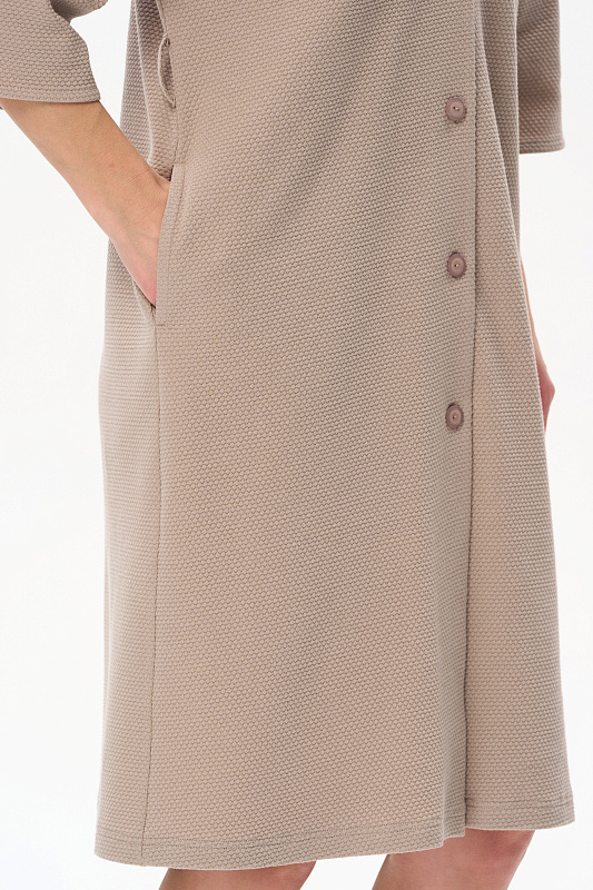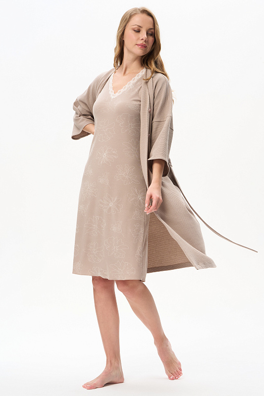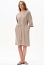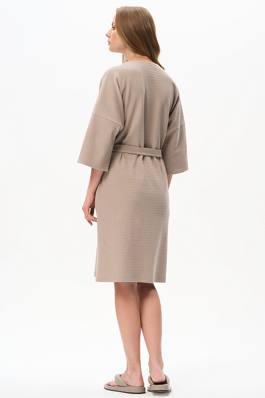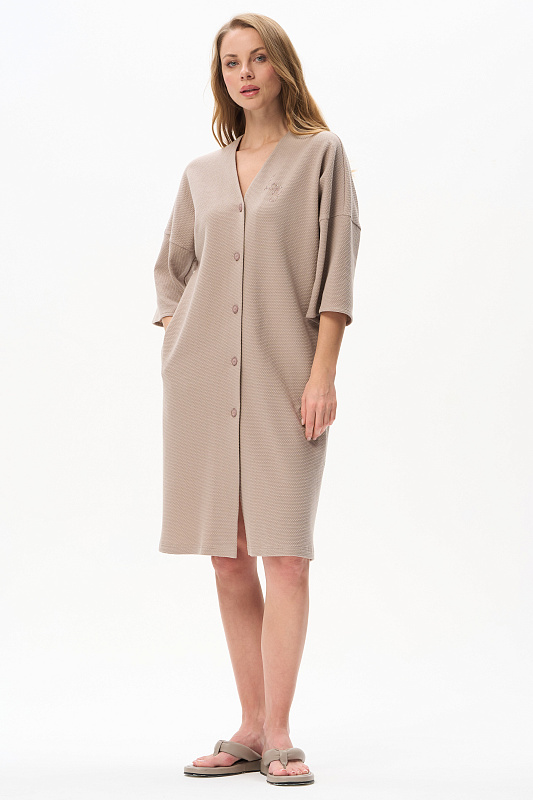 Удобный халат из однотонной хлопковой кулирки-жаккард с эластаном качества пенье 200 гр. Полотно мягкое, эластичное с новой интересной фактурой в оттенке мокко. Модель в стиле кимоно, прямого силуэта, длиной до колена, со спущенной линией проймы, рукава широкие длиной 7/8. Застёжка на пуговицы и красивая аппликация LORY из мерцающих страз. Интересная новинка для дома и отдыха. Рост модели 175 см.