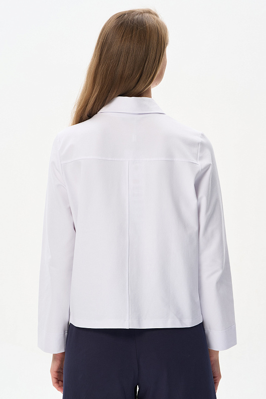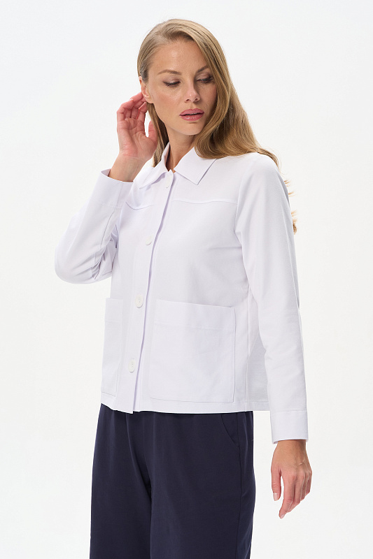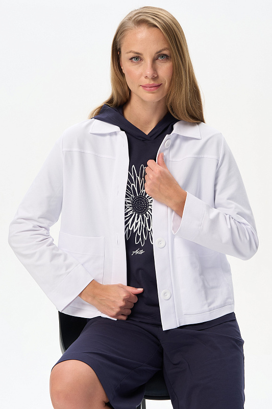 Лёгкий жакет из джинскота 240 гр в чистом белом оттенке. Модель прямого силуэта с классческим отложным воротником и застёжкой на пуговицы, накладные карманы, длинные втачные рукава с отворотом. Прекрасное решение для прогулок летними вечерами. Рост модели 175 см