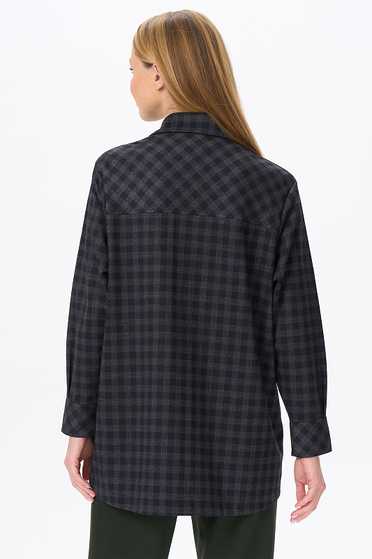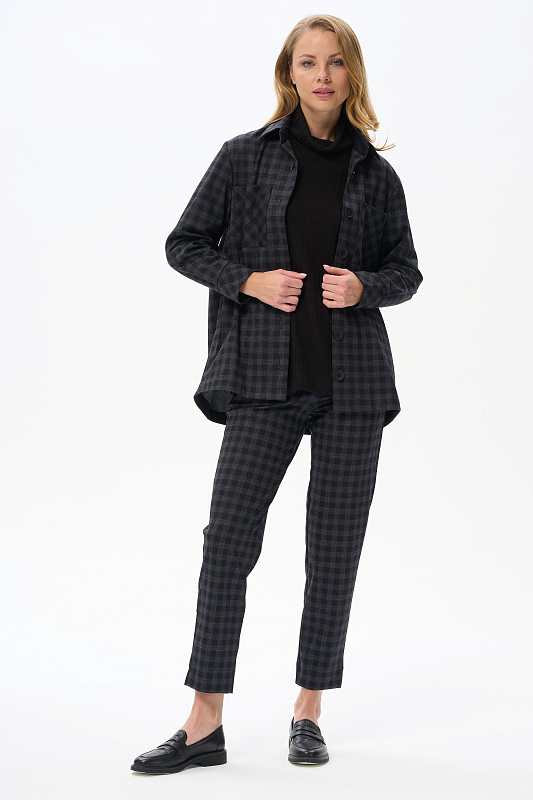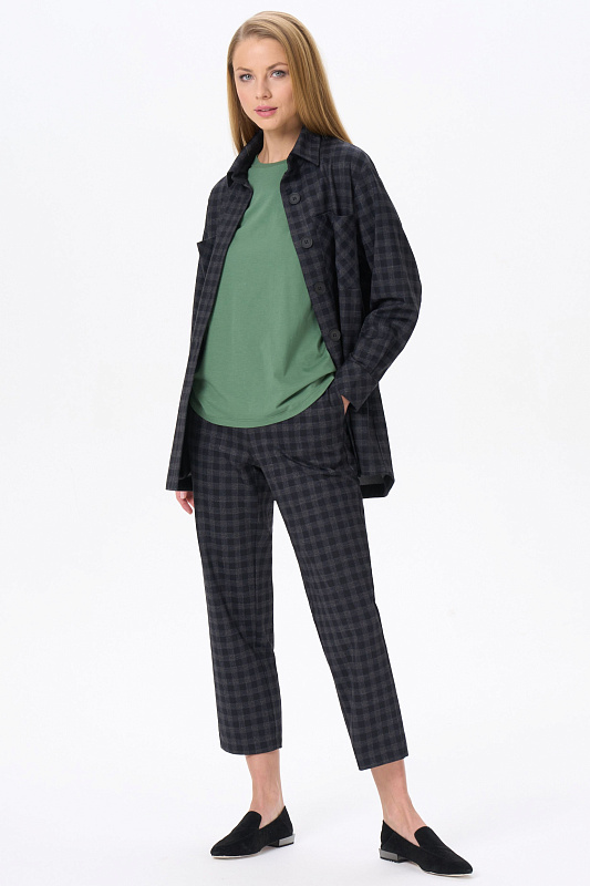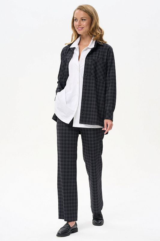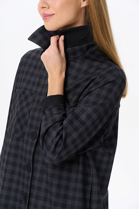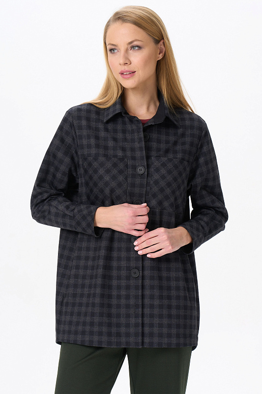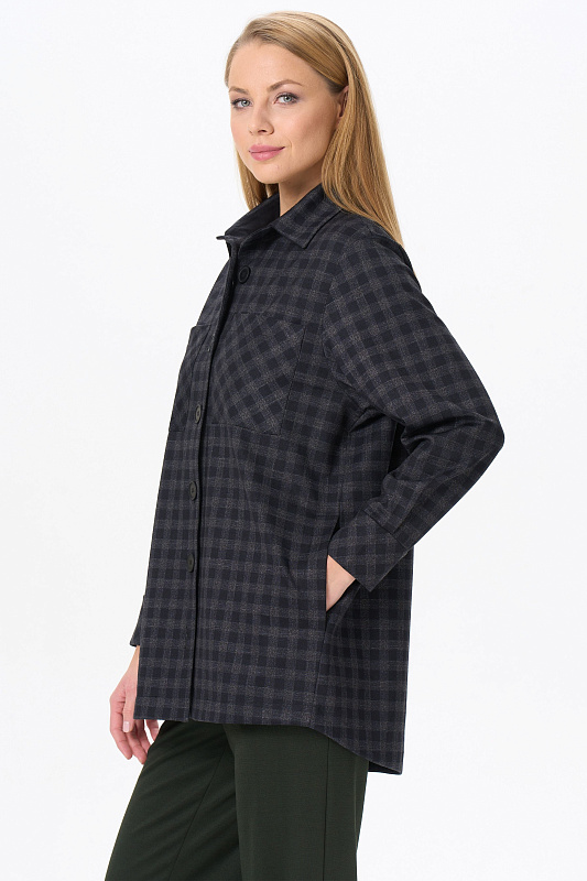 Куртка-рубашка оверсайз без подкладки из вискозного трикотажного полотна с принтом клетка. Воротник отложной на стойке, Длинные рукава на притачной манжете. На полочках накладные карманы, по спинке кокетка. Фигурная линия низа, в боковых швах карманы. Рост модели на фото 177.