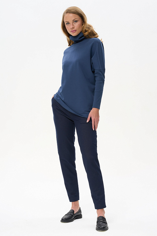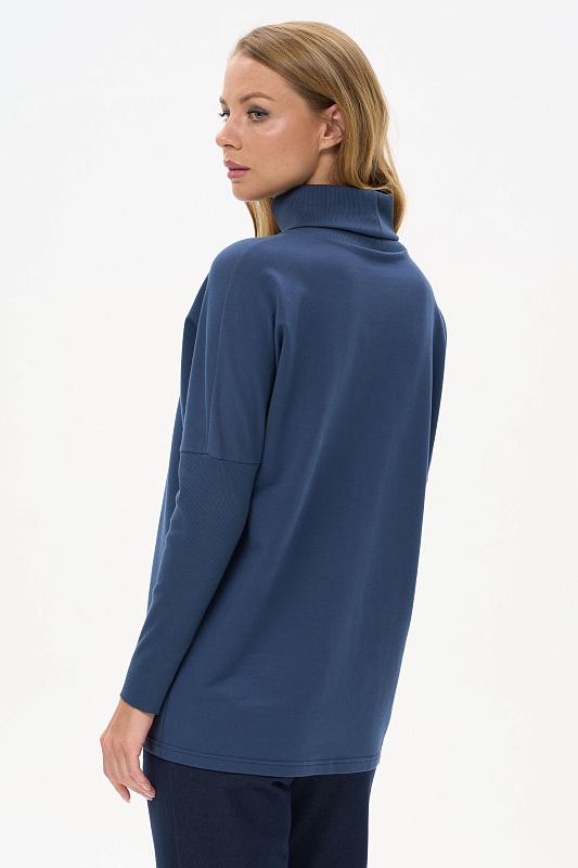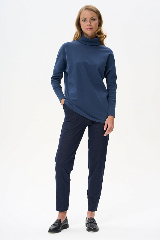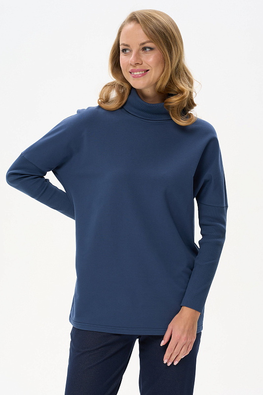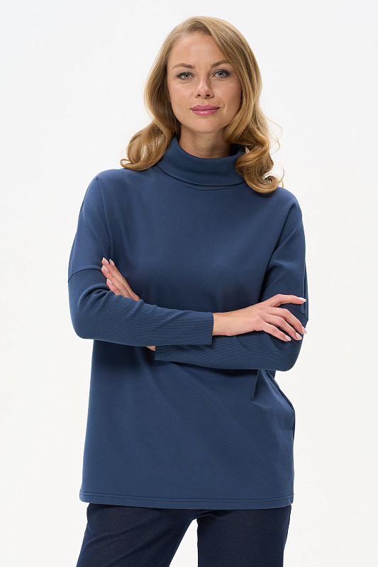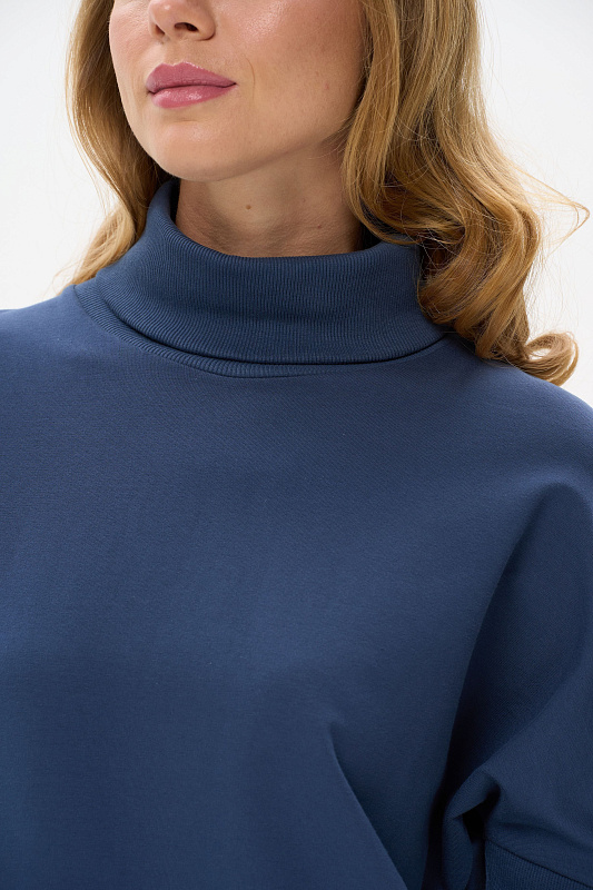 Джемпер из хлопкового футера с эластаном свободного силуэта. Мягкий воротник - стойка. Спущенная линия плеча, втачные рукава. Воротник и рукава выполнены из кашкорсе. Рост модели на фото 178 см.