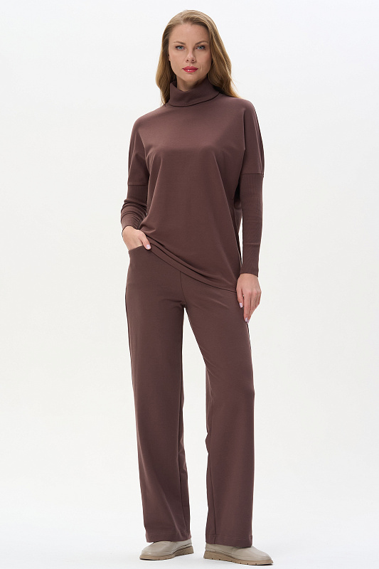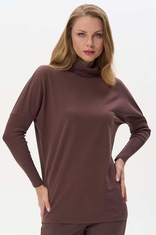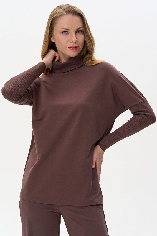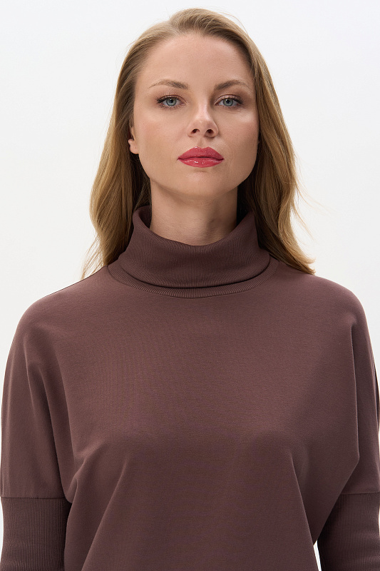 Джемпер из хлопкового футера с эластаном свободного силуэта. Мягкий воротник - стойка. Спущенная линия плеча, втачные рукава. Воротник и рукава выполнены из кашкорсе. Рост модели на фото 178 см.