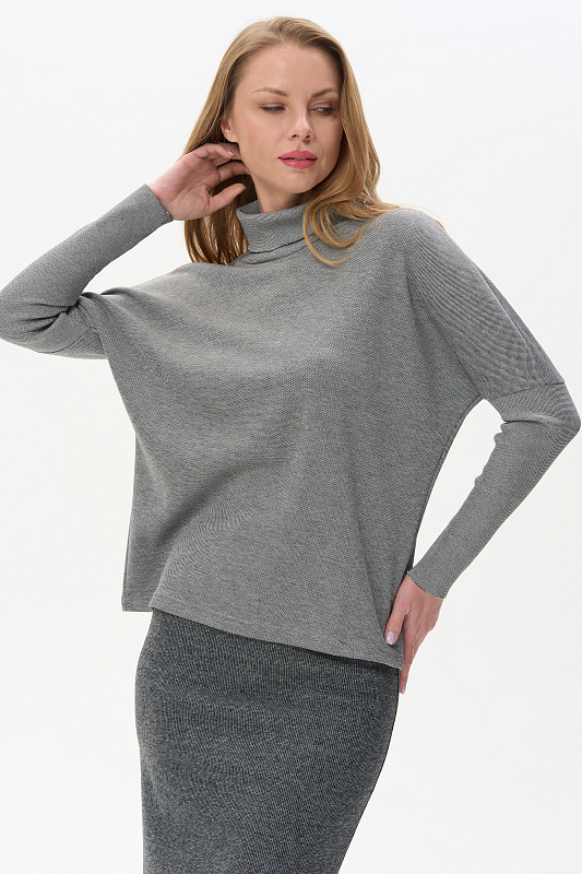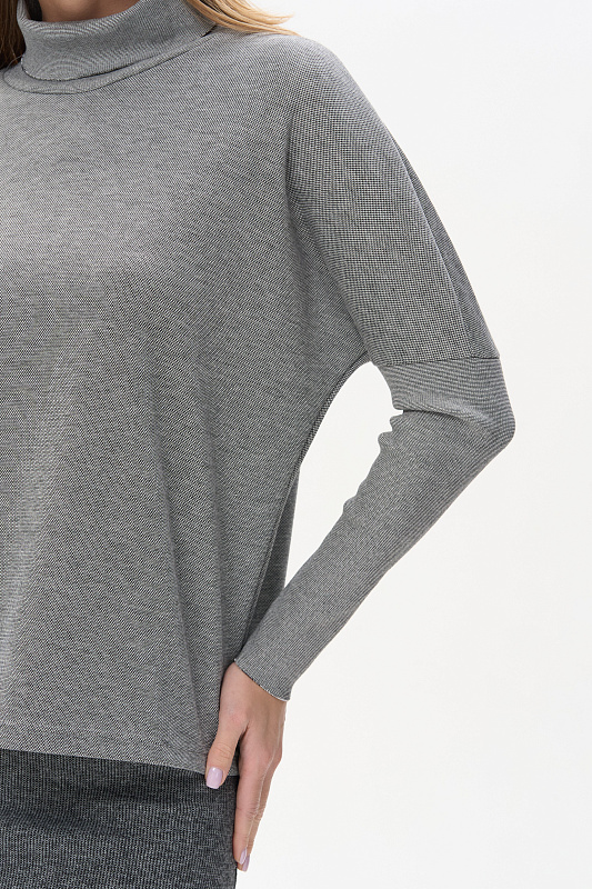 Джемпер свободного силуэта из хлопкового полотна с эффектом пике. Мягкий воротник - стойка. Спущенная линия плеча, втачные рукава. Воротник и рукава выполнены из кашкорсе. Рост модели на фото 178 см.