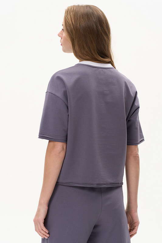Стильный джемпер из тонкого футера качества ПЕ 240 гр в трендовом оттенке Утренний туман. Круглый вырез горловины обработан хлопковым кашкорсе в Жемчужном оттенке, рукава до локтя, низ изделия с двойной деталью с открытыми срезами.