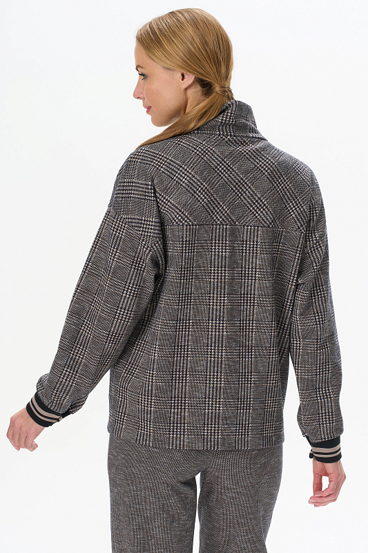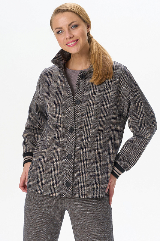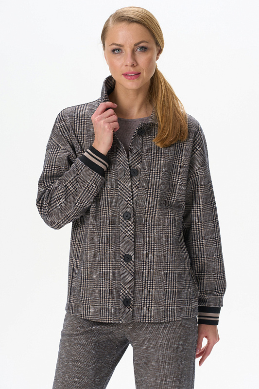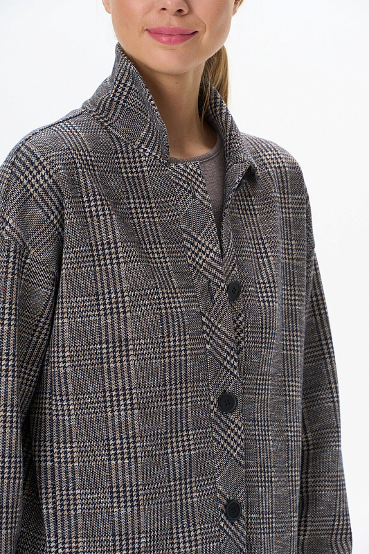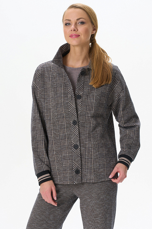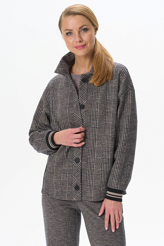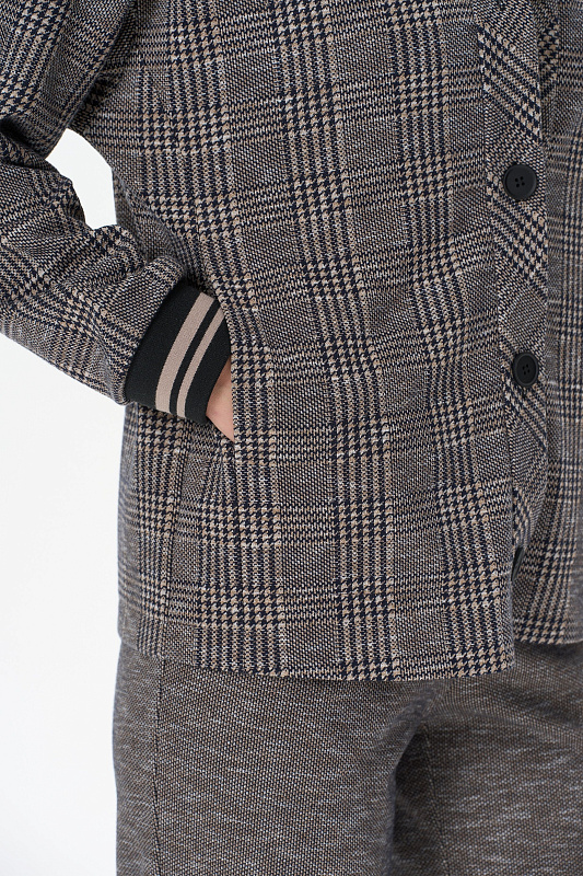 Повседневный жакет прямого силуэта из хлопкового жаккардового трикотажного полотна. Отложной воротник, застежка - планка на пуговицы, карманы в рельефных швах. Длинные втачные рукава на манжетах - подвяз (это трикотажное, плотное, вязаное полотно, имеющее вид резинки, которое производится на специальном оборудовании). Рост модели на фото 178 см.