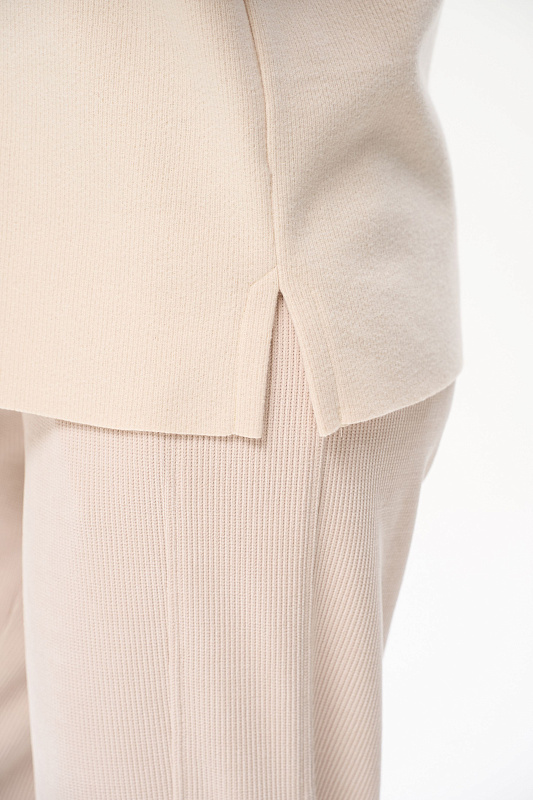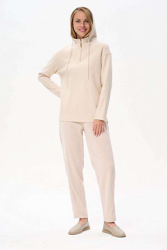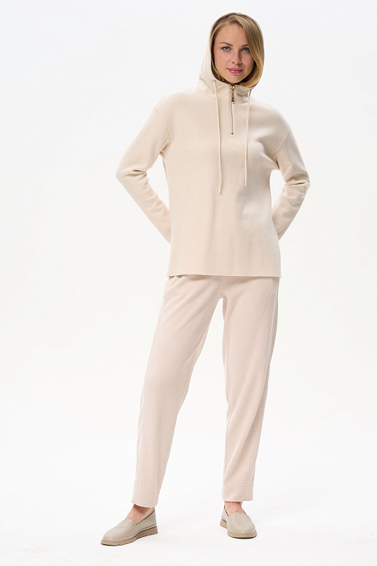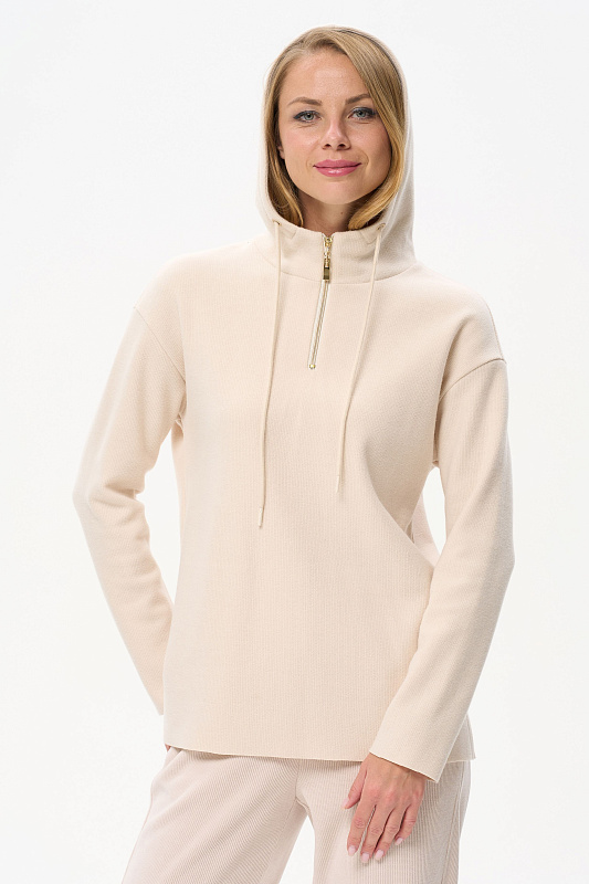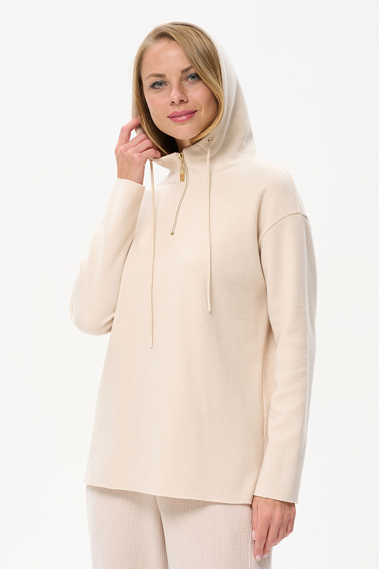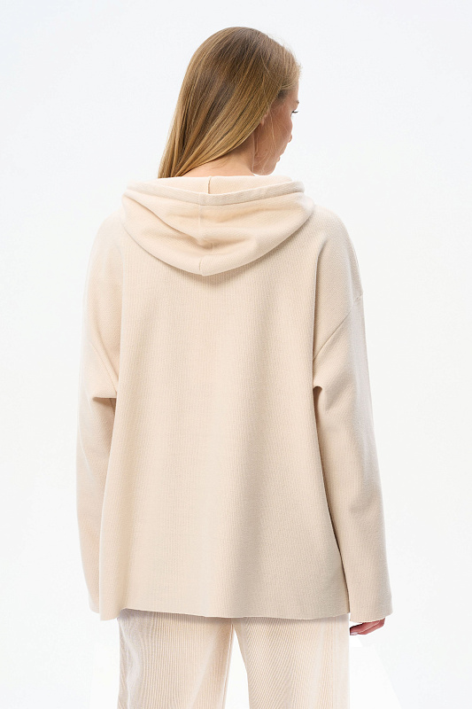 Джемпер свободного силуэта из вязаного вискозного полотна с капюшоном. Спущенная линия плеча, втачные длинные рукава. По низу боковых швов разрезы. Рост модели на фото 178 см.