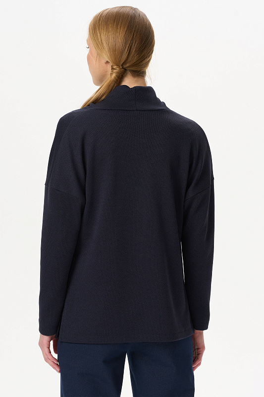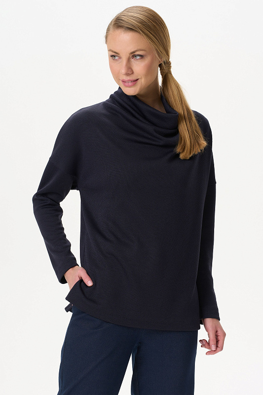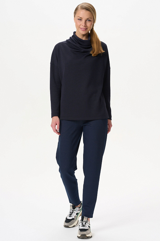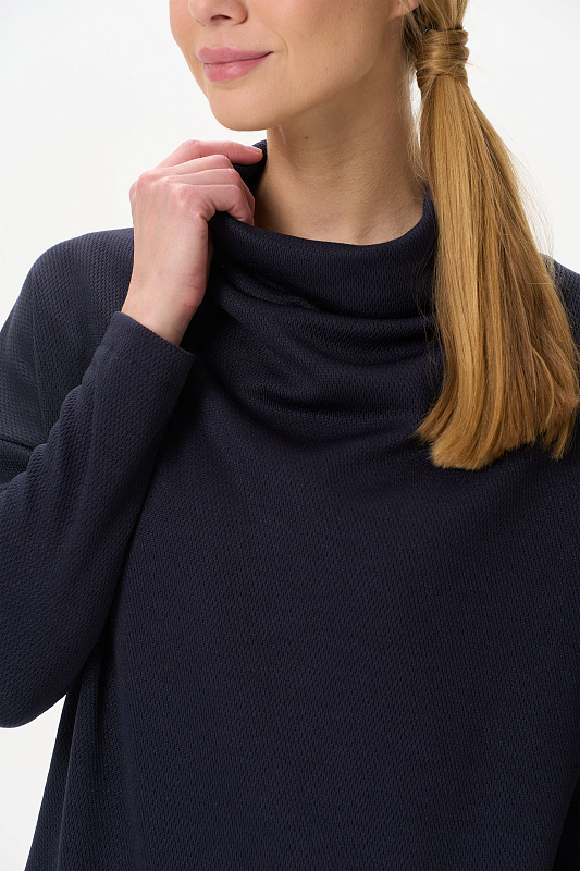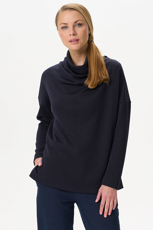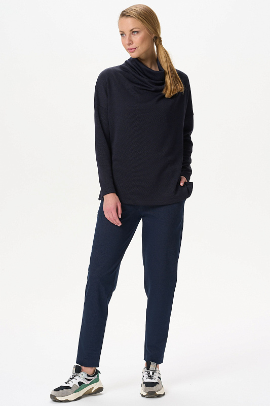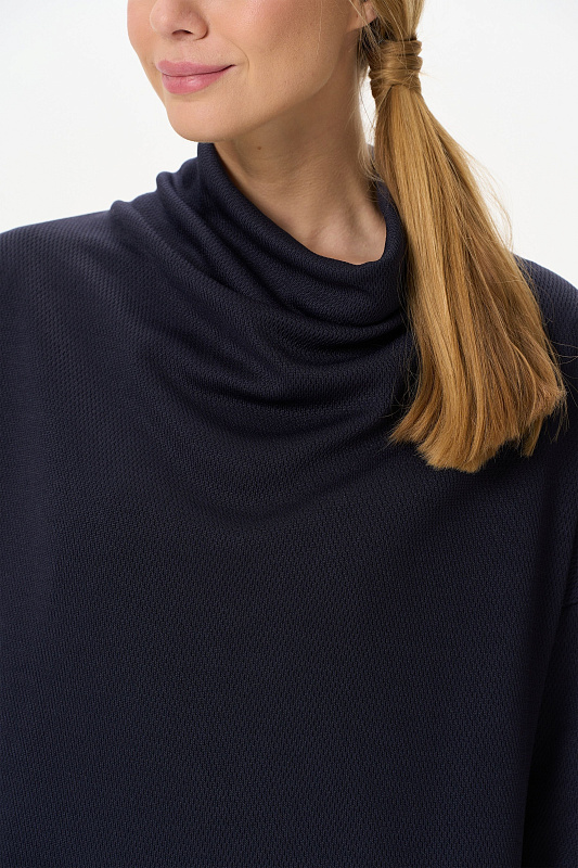 Джемпер выполнен из жаккардового трикотажного полотна. Воротник-хомут оформляет вырез горловины, который драпируется и закладывается естественными складками. Спущеннаая линия плеча, втачные рукава. По низу в боковых швах разрезы. Рост модели на фото 178 см.