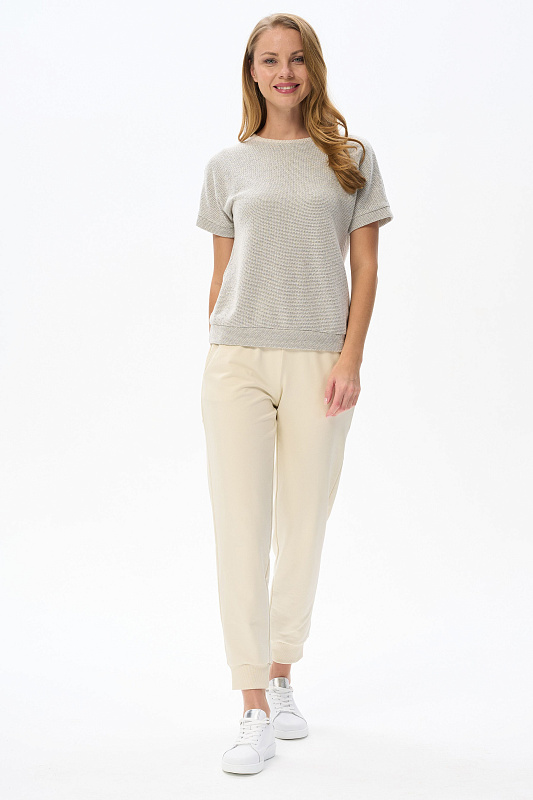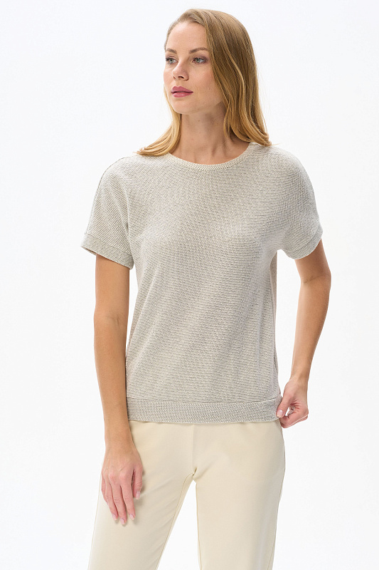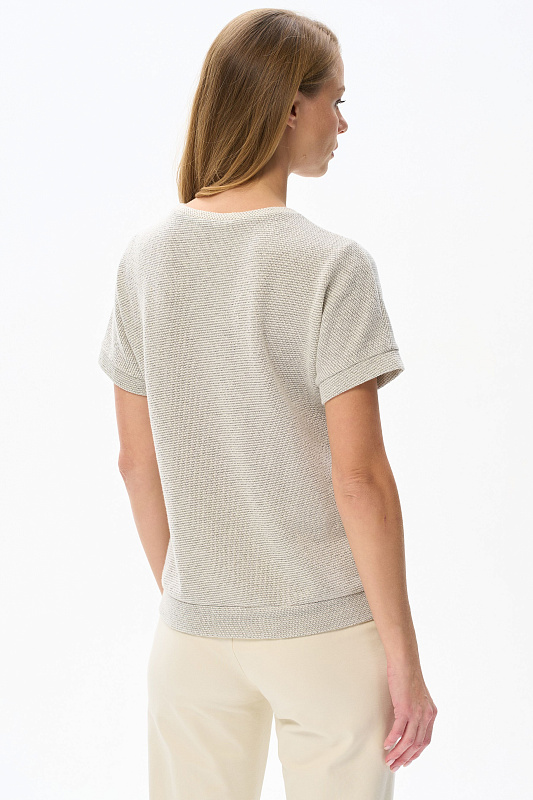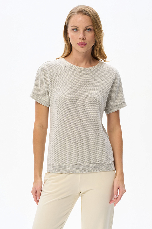 Джемпер из мягкого фактурного жаккарда 240 гр.в серо-зелёном светлом оттенке. Модель с круглым вырезом горловины и цельнокроеными короткими рукавами. Особенность модели - приятная релаксирующая поверхность полотна. Отлично подходит ко всем низам коллекции. Рост модели 175 см.