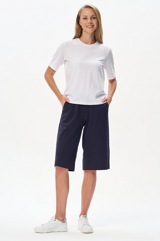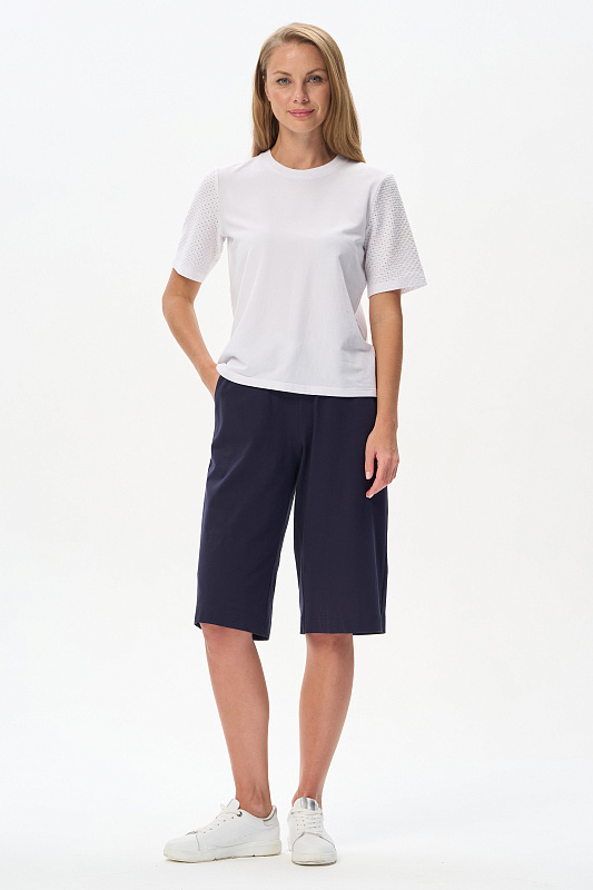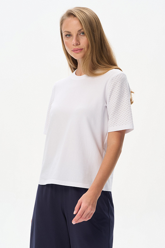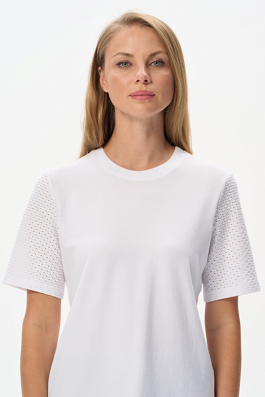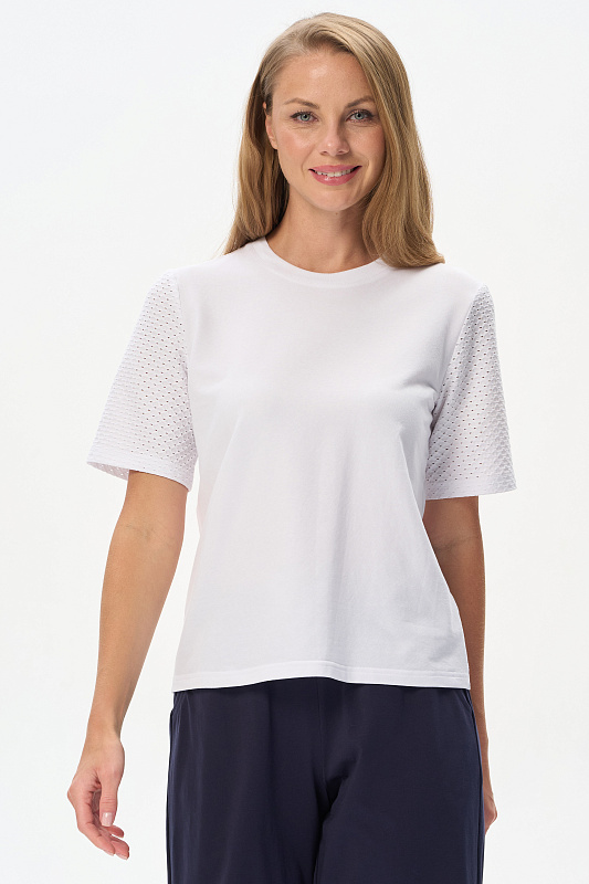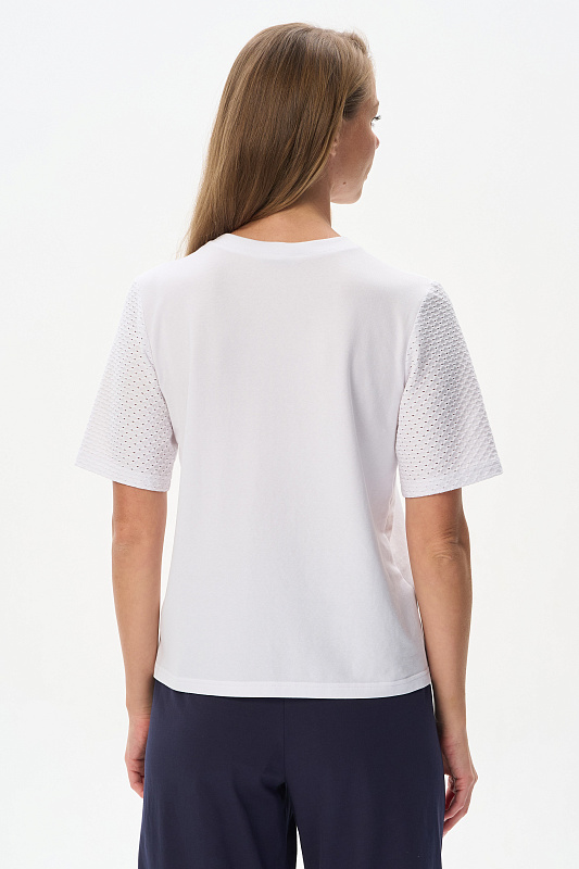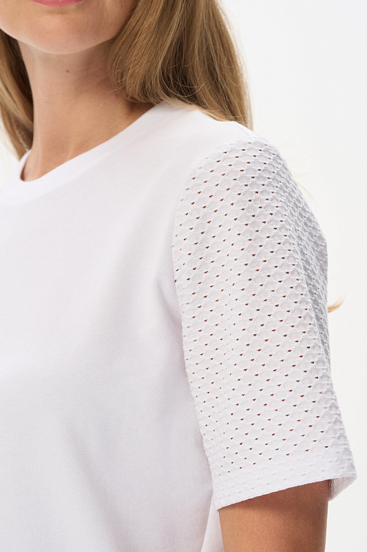 Джемпер из тонкой трикотажной джинсы 165 гр в чистом белом оттенке с рукавами из фактурного хлопкового трикотажа. Модель прямого силуэта, с идеальной посадкой, рукава средней длины, круглый вырез горловины из рибаны, Прекрасная модель для летних образов. Красивая трендовая фактура выглядит эффектно и сделает ваш образ нарядным. Рост модели 175 см