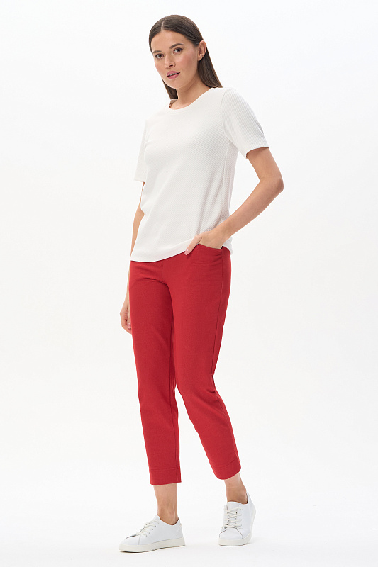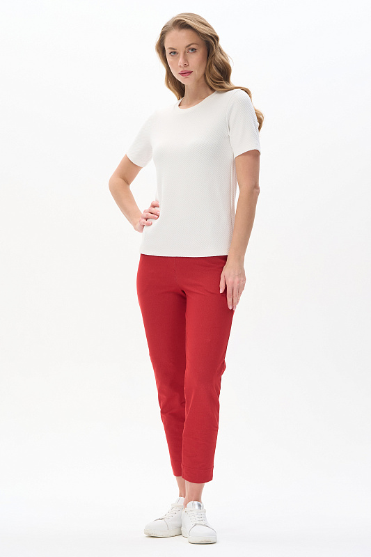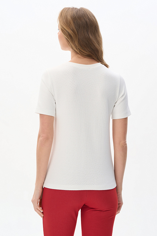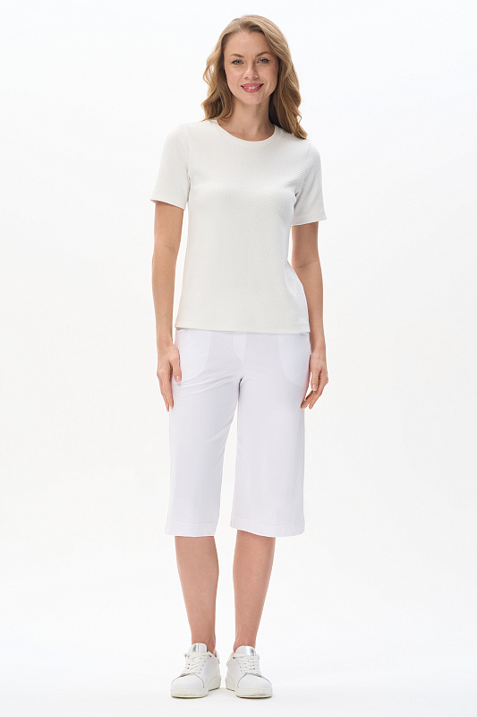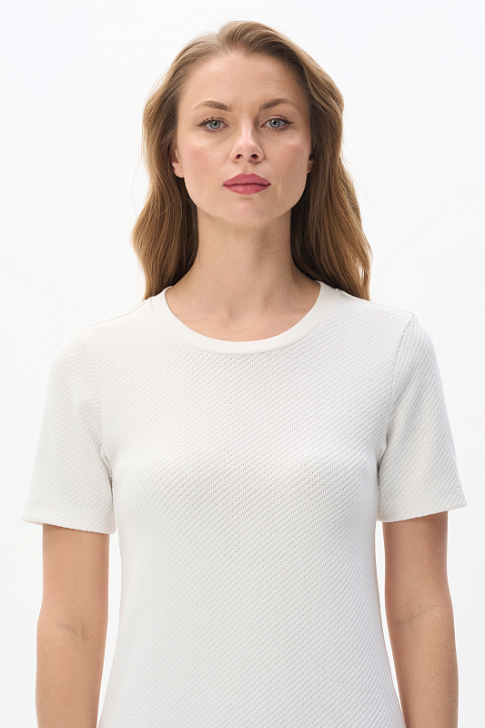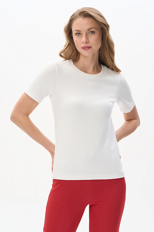 Джемпер из нового вискозного Жаккарда 380 гр с диагональной фактурой. Модель небольшого объёма, прямого силуэта, круглый вырез горловины обработан кашкорсе, втачные короткие рукава. Комфортный джемпер для весенне-летнего сезона, благодаря плотному полотну и красивой фактуре выглядит эстетично, подходит для офиса и города. Рост модели 175 см.