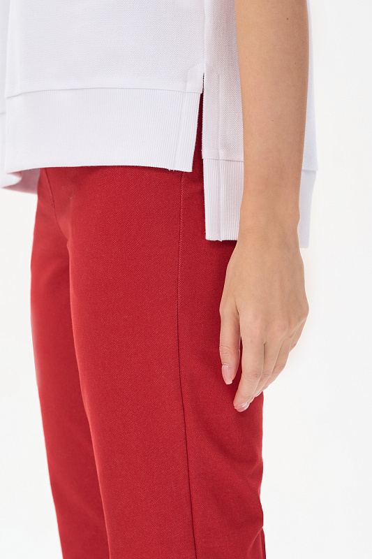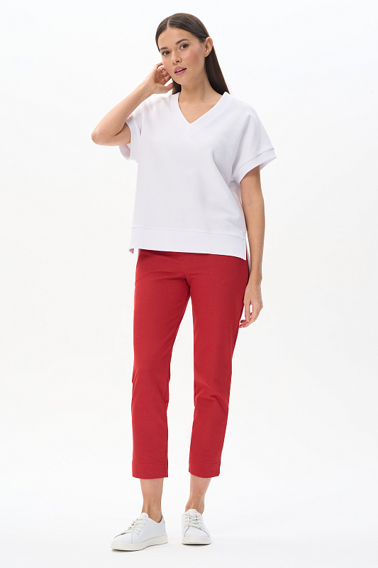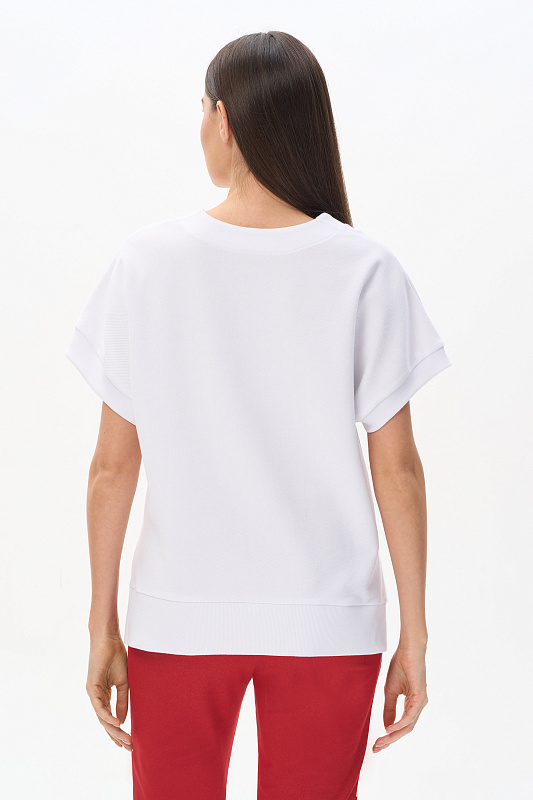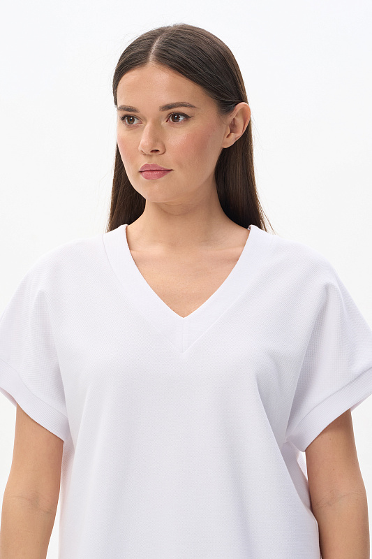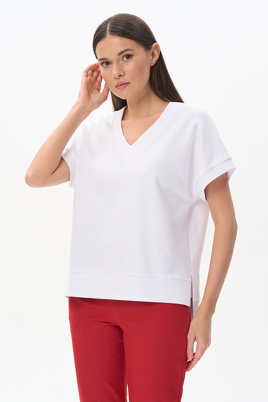 Жилет из нового фактурного полотна футер-пике, качества ПЕ 250 гр.в чистом белом оттенке. Модель прямого силуэта, глубокий V-образный вырез, спущенное плечо, проймы и низ обработаны кашкорсе, по бокам разрезы. Жилет с разной длиной полочки и спинки - трендовое решение для весенне-летнего сезона. Можно носить с футболкой, лонгсливом и как первый слой, создавая разные стилистические решения. Рост модели 175 см.