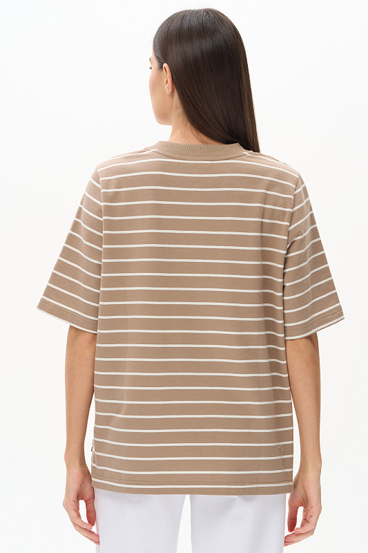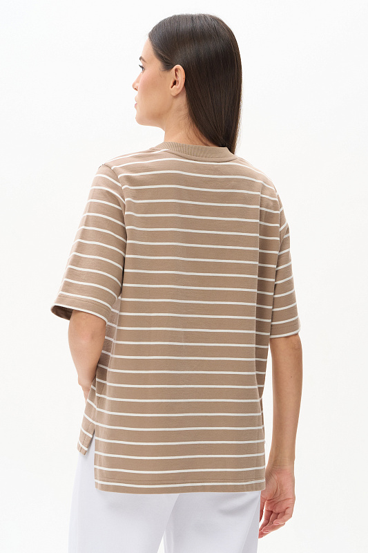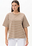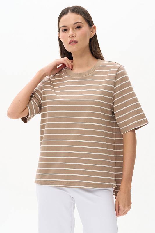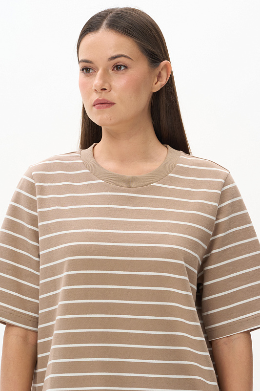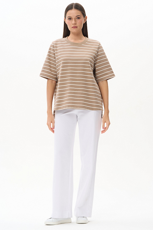 Джемпер из тонкого футера 200 гр качества ПЕ полоска в оттенках Дюны и Молочный. Модель свободная, прямого силуэта, круглый вырез горловины обработан кашкорсе, втачные рукава длиной до локтя, в боковых швах разрезы. Джемпер с разной длиной полочки и спинки - трендовое решение для весенне-летнего сезона. Рост модели 175 см.