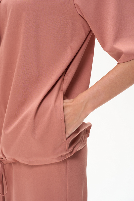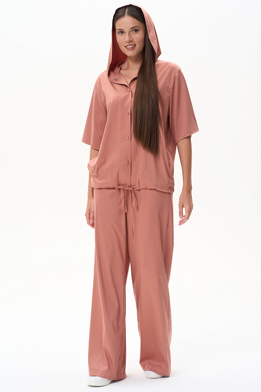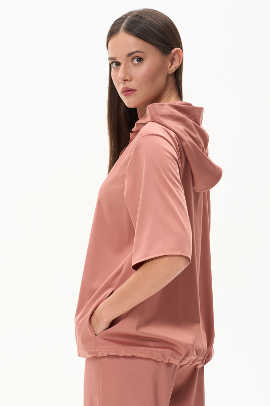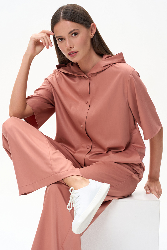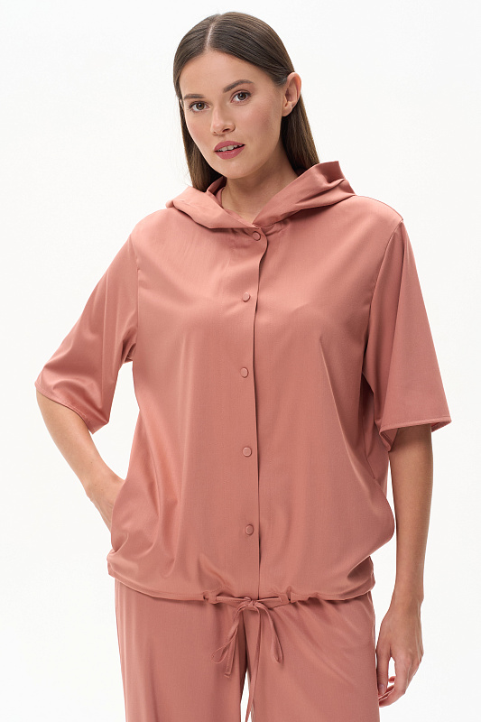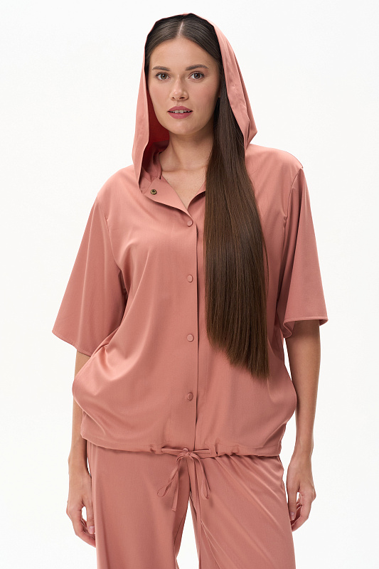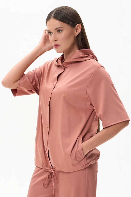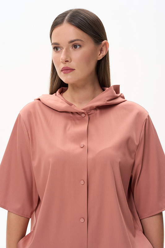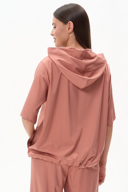 Летняя куртка с капюшоном типа ветровки из эксклюзивной ткани с бамбуком. Модель прямого силуэта, длина закрывает бедра, регулируется кулиской по низу изделия. Рукава до локтя, карманы в боковых швах, застёжка на кнопки в тон. Модель подразумевается как второй слой поверх футболки, но может использоваться и как основной предмет. Рост модели 175 см.