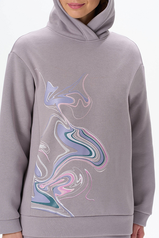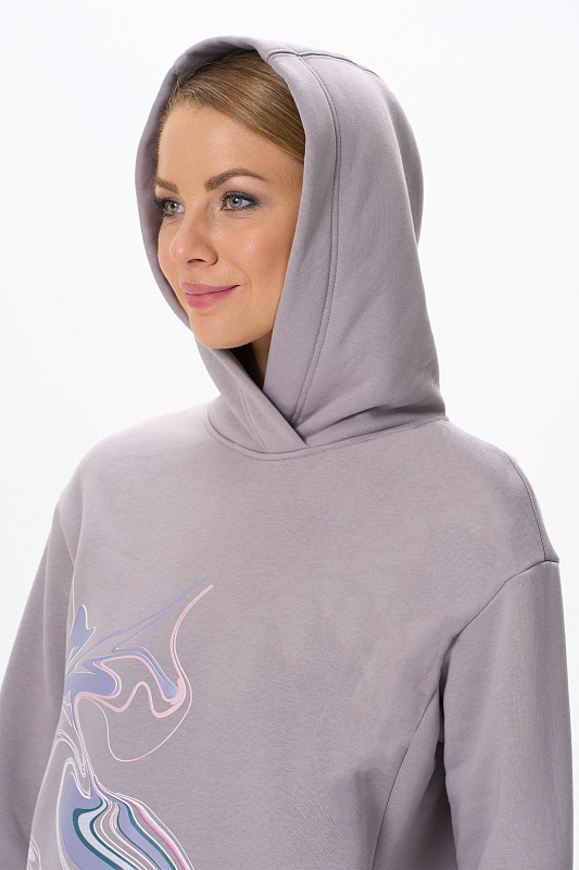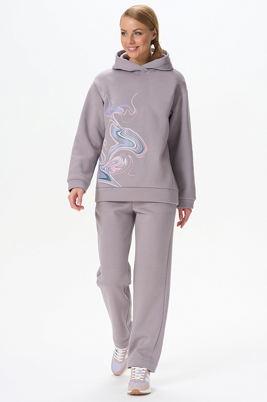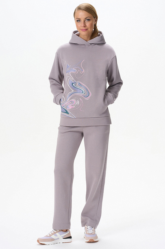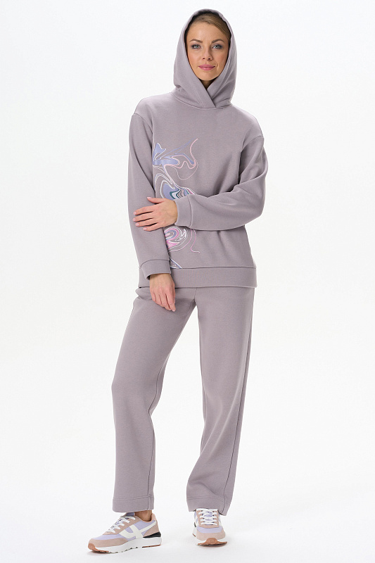 Комплект из хлопкового футера высого качества 3-х нитки стриженный начес, состоит из толстовки и брюк. Толстовка украшена ярким принтом. Капюшон на подкладке, карманы в рельефных швах. Длинные прямые брюки с карманами и поясом с эластичной тесьмой внутри. Рост модели на фото 177