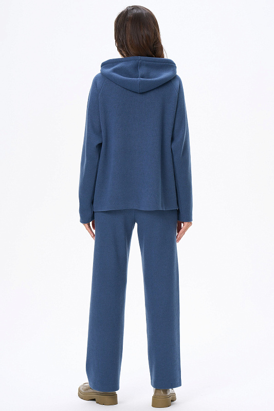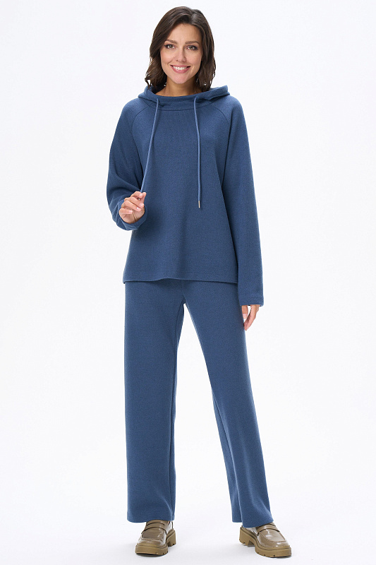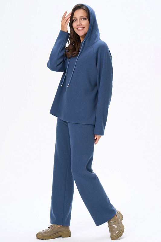 Комплект из вязаного вискозного полотна. Джемпер свободного силуэта с капюшоном. Рукава реглан. Длинные прямые брюки. Пояс с эластичной тесьмой внутри. Рост модели на фото 170