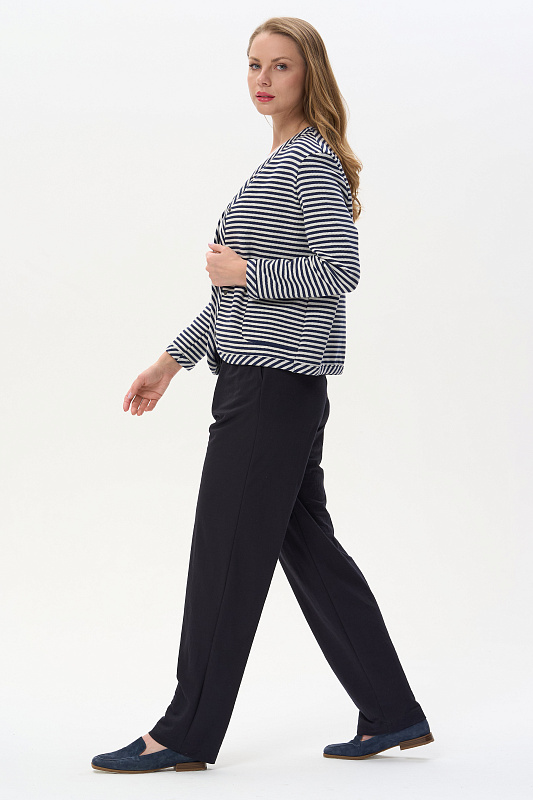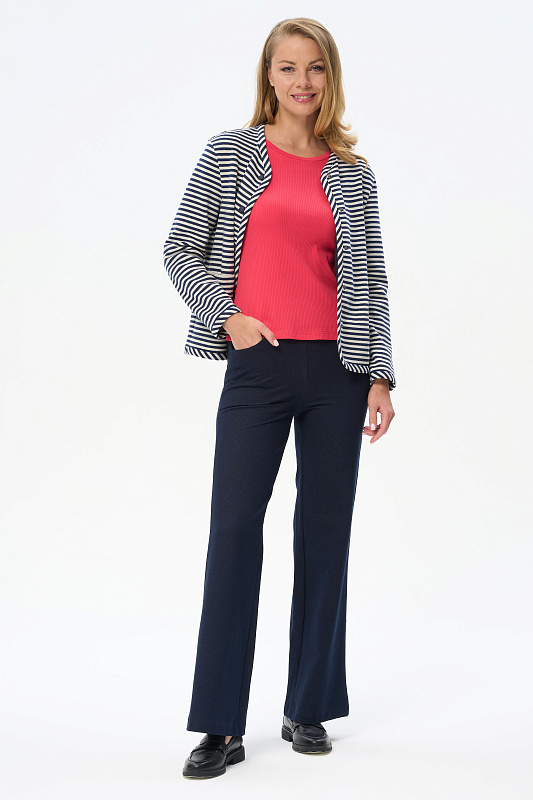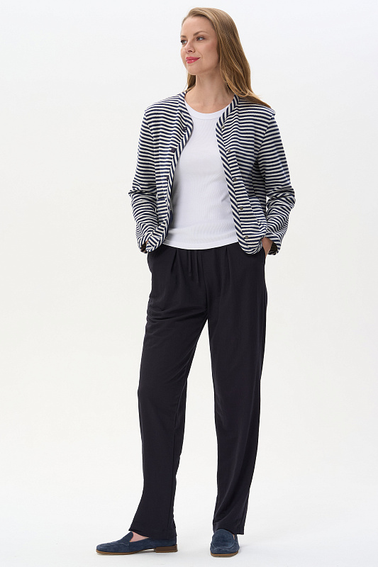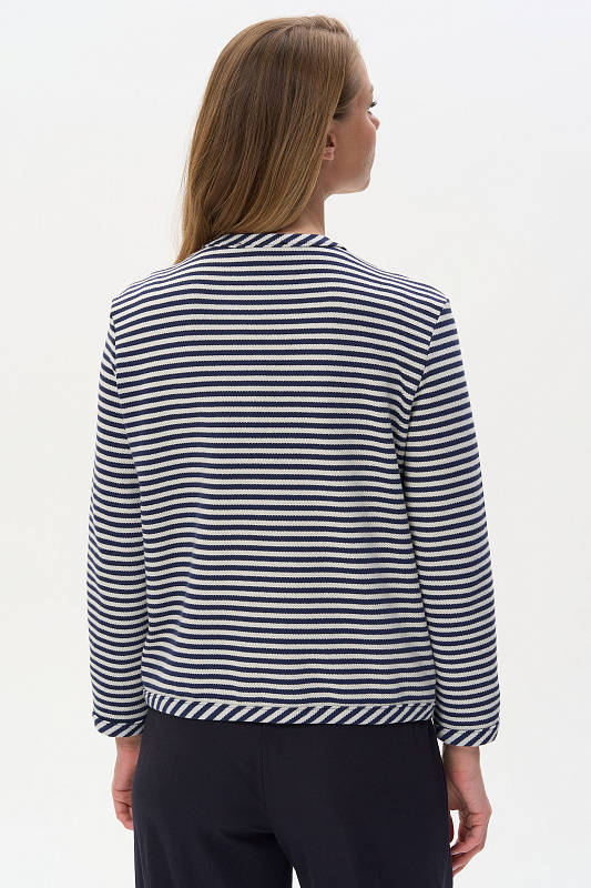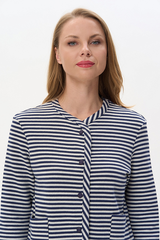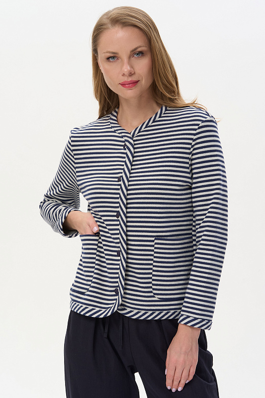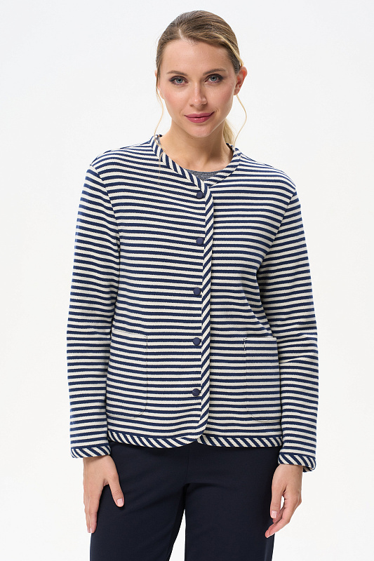 Жакет из хлопкового жаккарда 300 гр. в полоску с диагональной фактурой в оттенках Глубокий синий и Облачный танцор. Полотно с добавлением ПЭ и эластана для придания пластичности и формоустойчивости жакета. Модель полуприлегающего силуэта, круглая горловина, застёжка на кнопки, длинные втачные рукава, удобные накладные карманы. Классический принт в полоску всегда остается популярным и трендовым. Сочетается с джинсами и легкими брюками. Идеальный жакет для повседневной носки в любое время года. Рост модели 175 см
