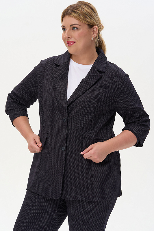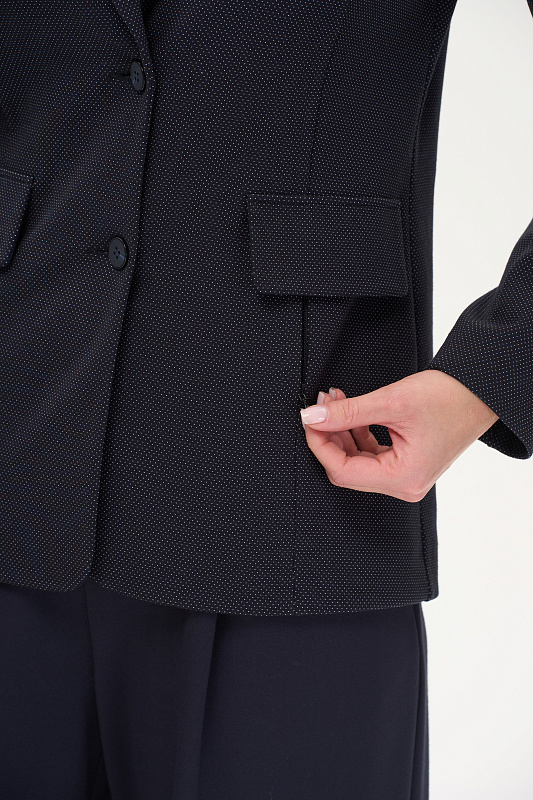Классический жакет из эластичного жаккардового полотна, в мелкий горошек. Полуприлегающий силуэт. Карманы с потайными молниями в рельефах, под накладными клапанами.