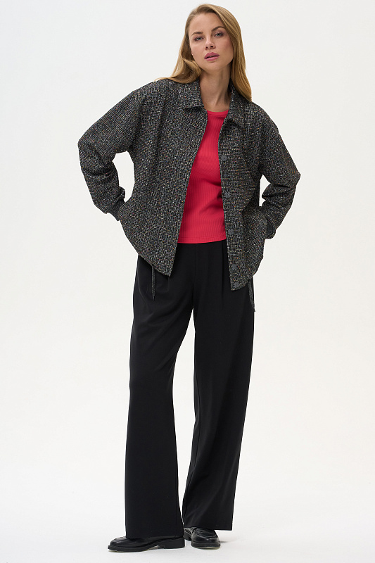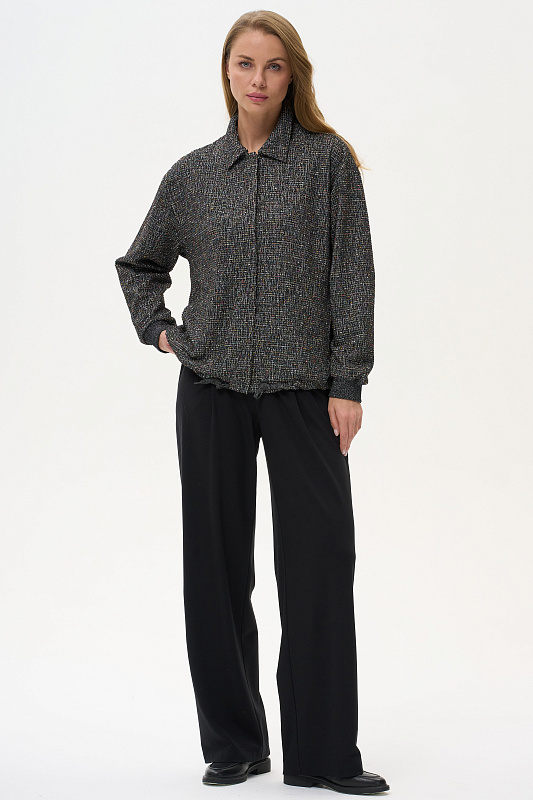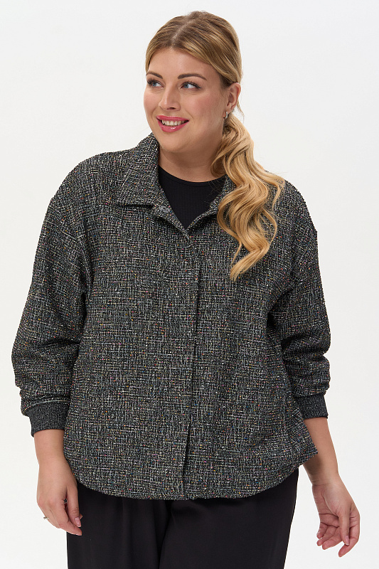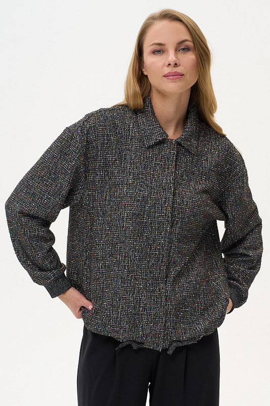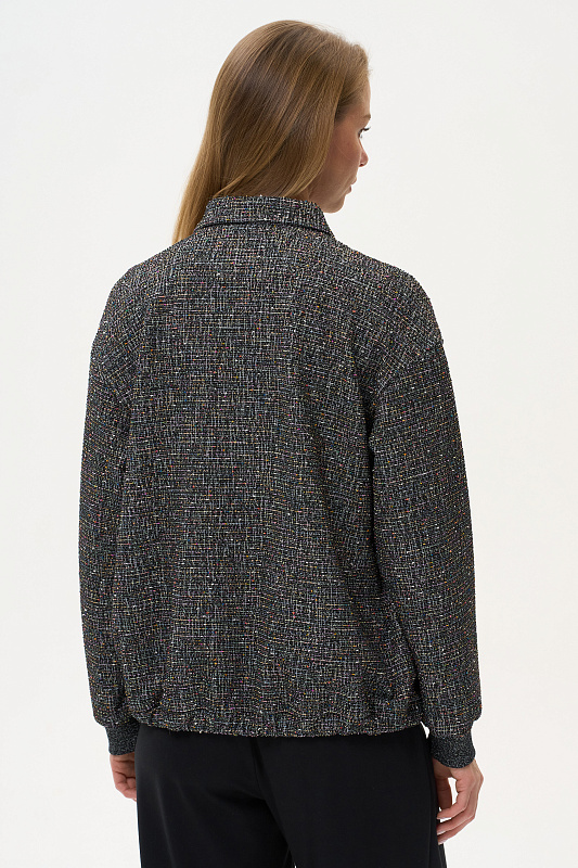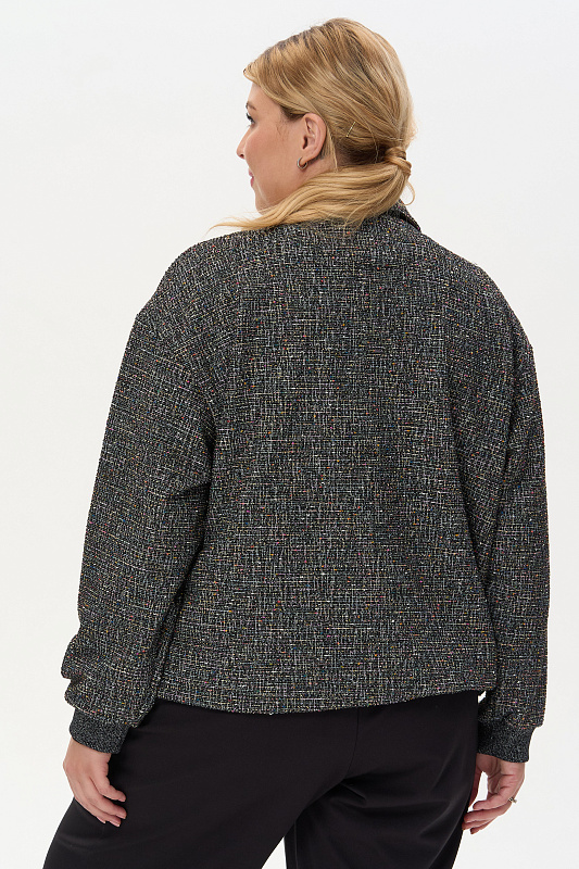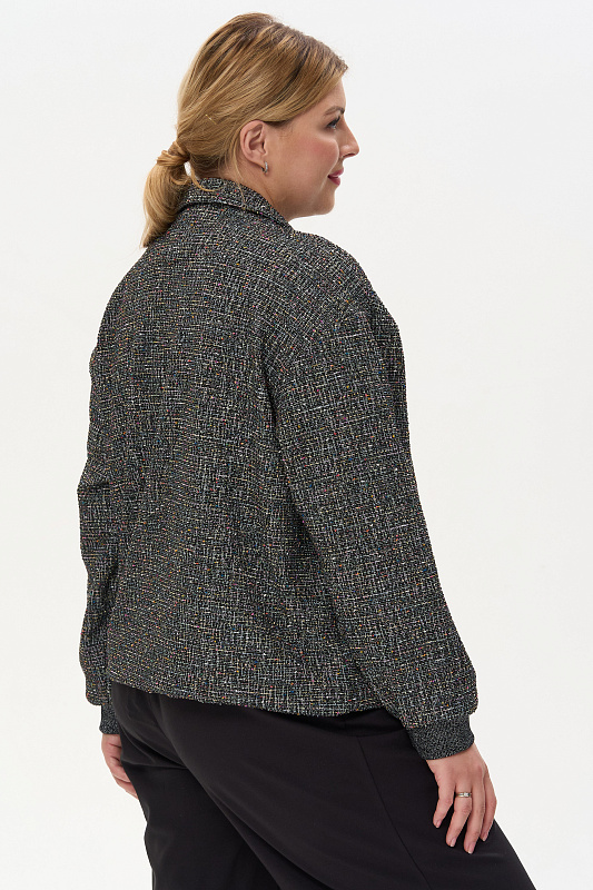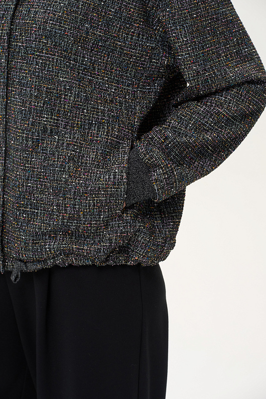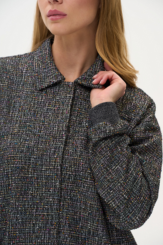 Жаккардовый жакет выполнен из буклированного вискозного полотна под твид. Жакет свободного кроя со спущенным рукавом. Манжеты из кашкорсе с люрексом. Низ жакета на кулиске, со декоративным шнуром из люрекса. Пришивные кнопки в цвет полотна создают впечатление потайной застежки. Рост модели на фото 178см