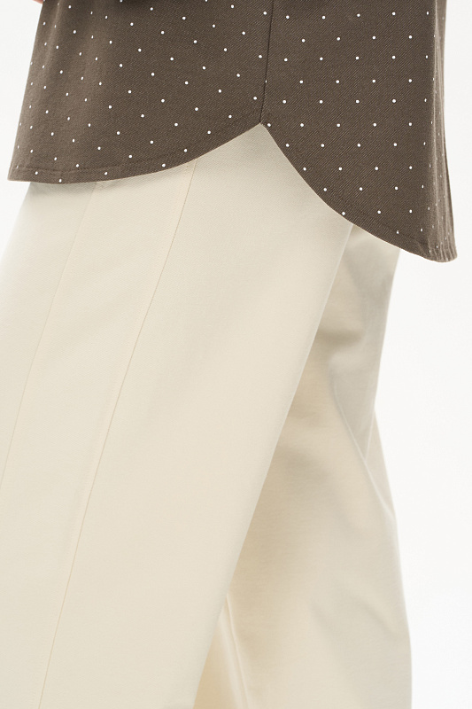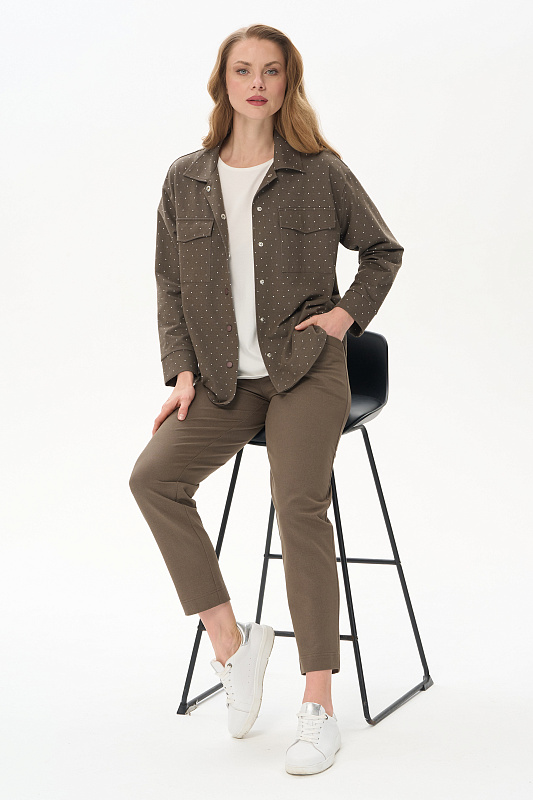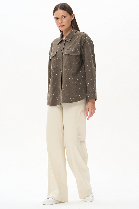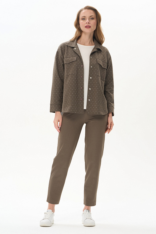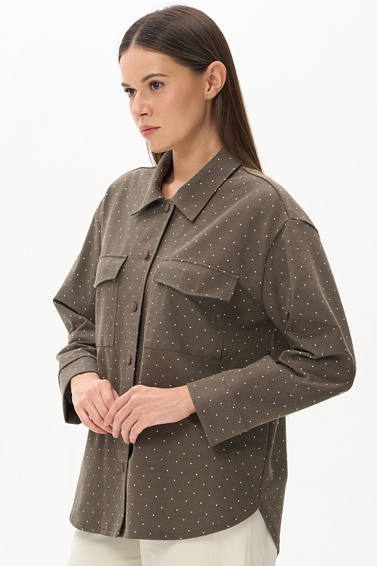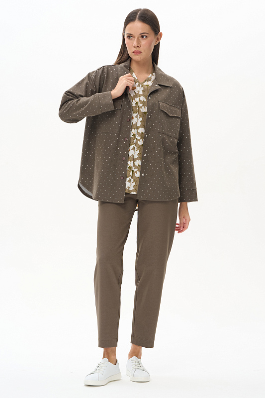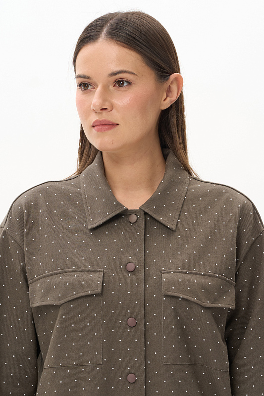 Куртка-рубашка из джинскота 240 гр в белый горошек на фоне хаки. Модель с застежкой на удобные кнопки в цвет полотна. Накладные карманы с клапанами и закругленный низ придают модели современный характер. Рукава длиной 7/8 с отворачивающимися манжетами. Комфортное решение для прогулок летними вечерами. Идеальный компаньон к куртке - однотонные брюки в оттенке Хаки. Рост модели 175 см.