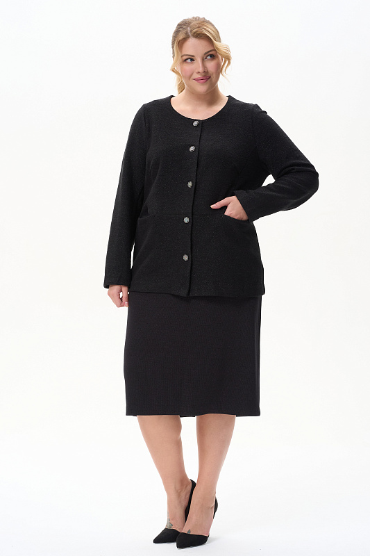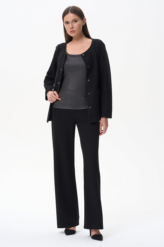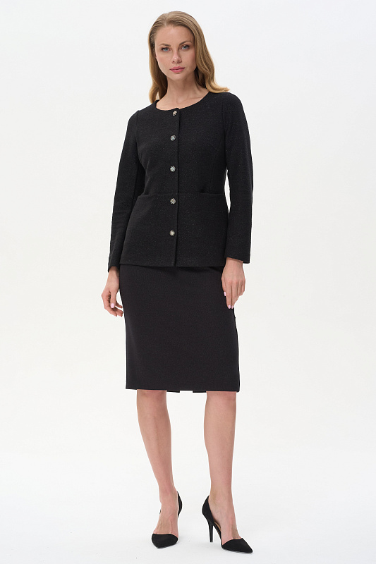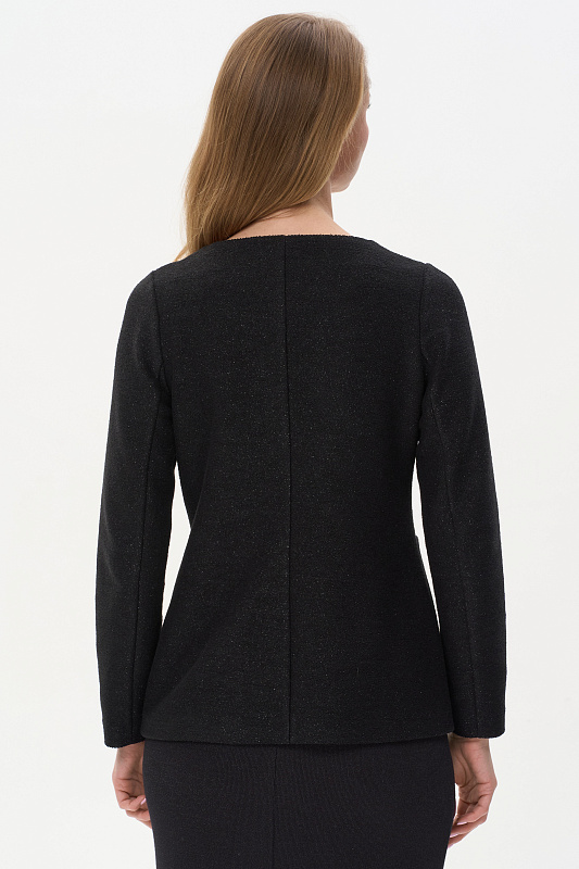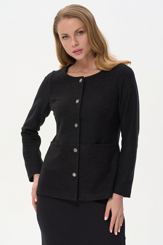 Элегантный жакет в стиле Chanel из трикотажного полотна с люрексом по лицевой стороне и гладкой изнаночной. Акцентный глубокий вырез позволяет открыть шею и подчеркнуть её красивыми украшениями. Выделяют жакет нарядные кнопки. Конструктивные линии и шов по спинке стройнит фигуру. Рост модели 175 см