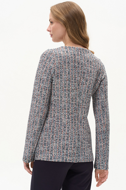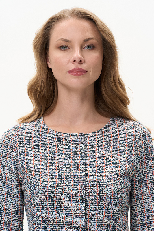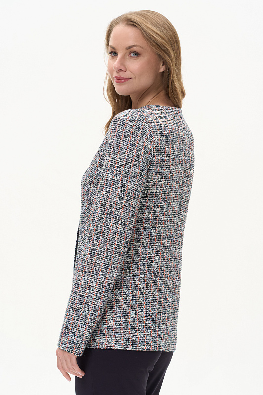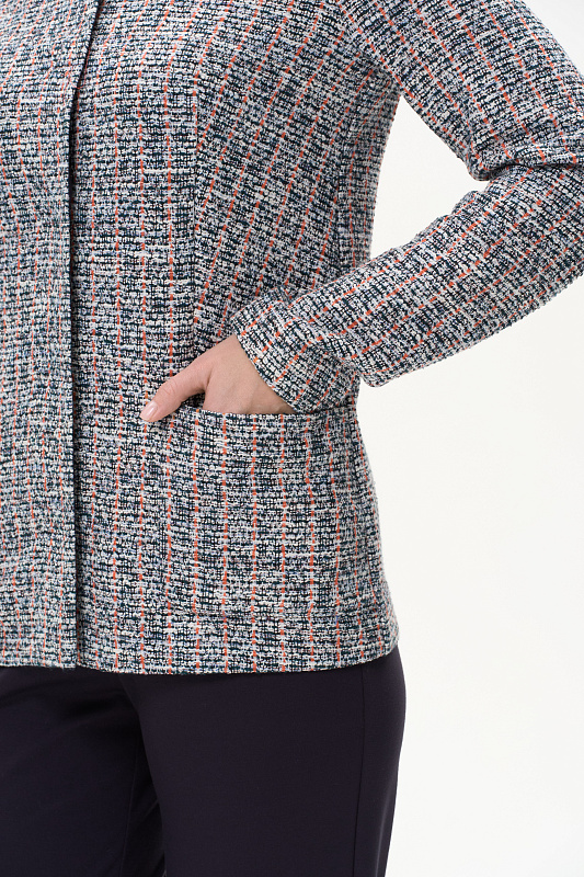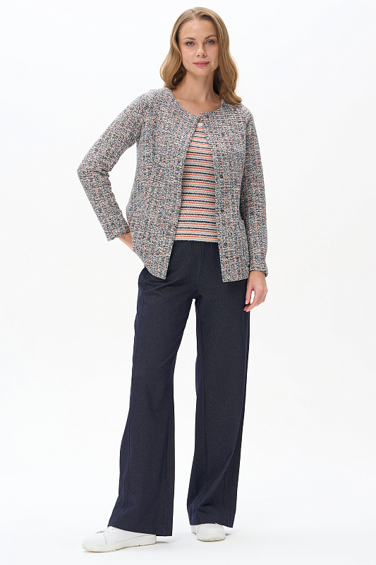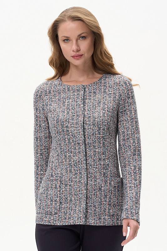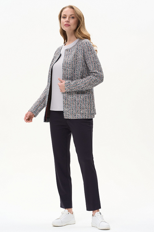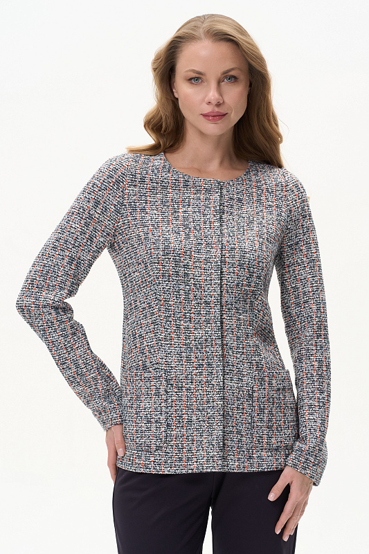 Классический кардиган полуприлегающего силуэта выполнен из жаккарда в стиле Chanel. Благодаря втачному рукаву с чуть завышенной проймой и вытачкой по окату обеспечена идеальная посадка на любой фигуре. Обтачка горловины и подборт выполнены из гладкой кулирки и окантованы контрастным полотном. Невидимые внутренние кнопки - изюминка этой модели. Рост модели 175 см