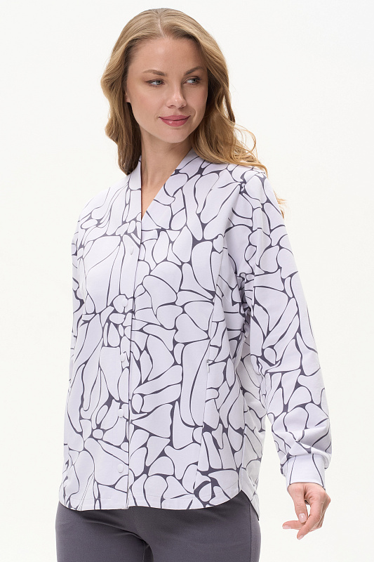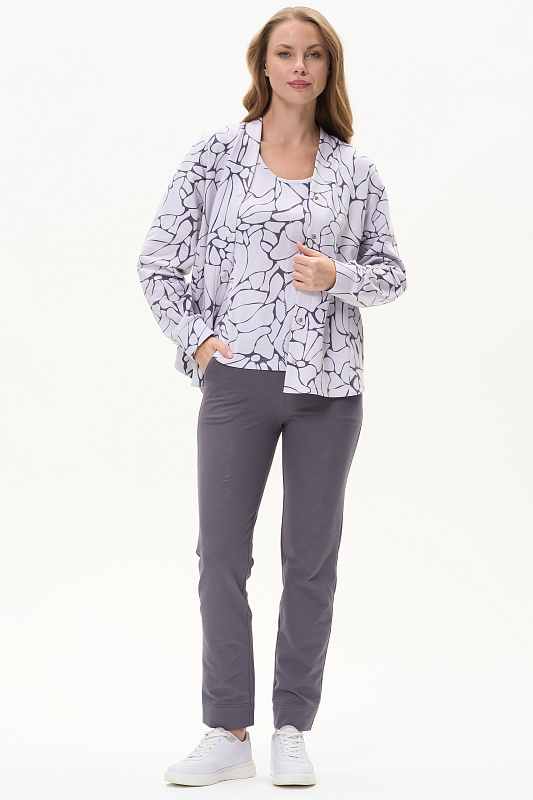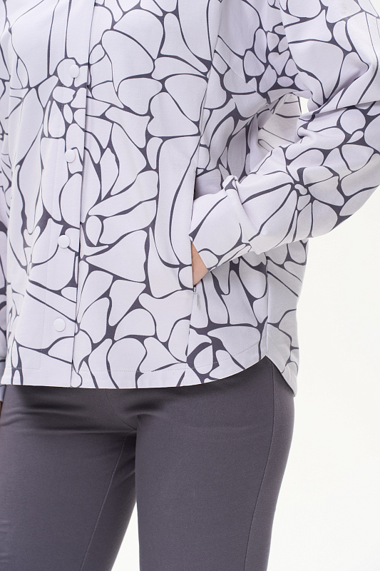 Легкий жакет выполнен из набивного футера c дизайнерским рисунком. Длина до середины бедер. За основу конструкции рукава взят крой народного костюма, что обеспечивает свободу и удобство в носке. Застежка на кнопках позволяет носить жакет как рубашку. В рельефах – карманы на потайных молниях. Низ изделия закруглен, край окантован с изнанки. Рост модели 175 см