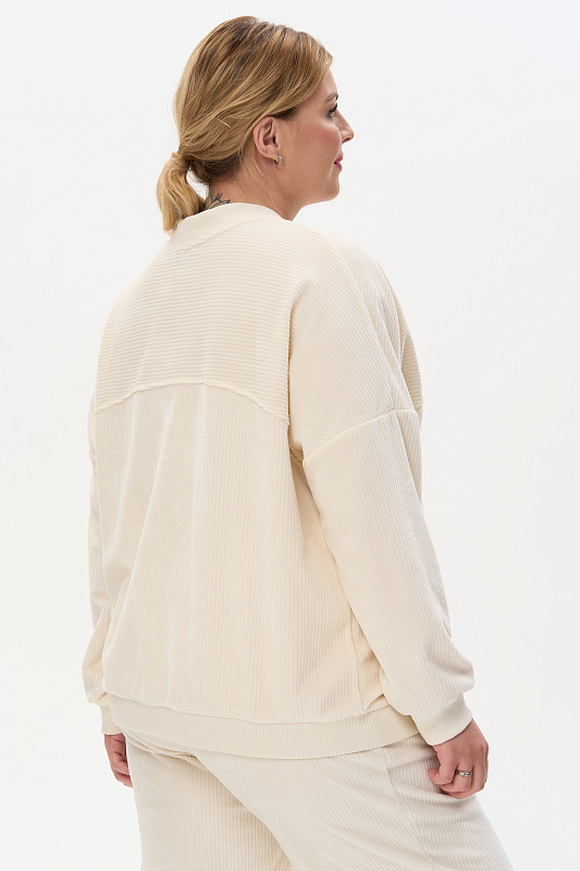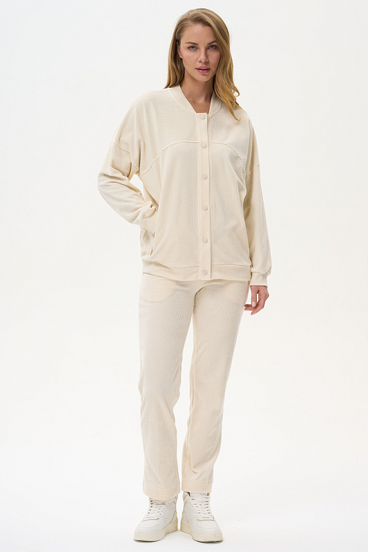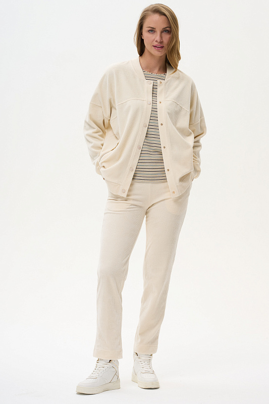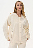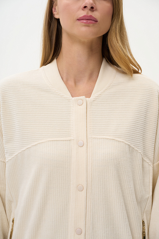 Куртка из трикотажного вельвета в элегантном молочном цвете. Карманы с золотистыми молниями. Рост модели 175 см.
