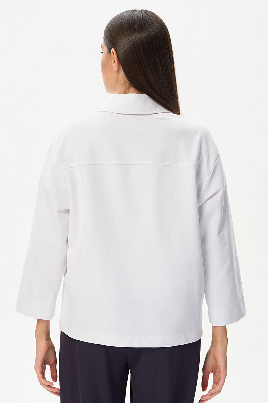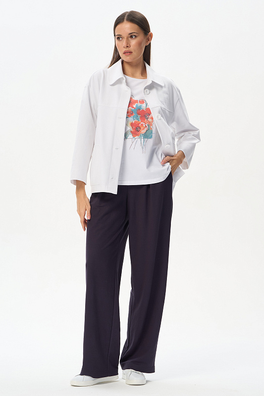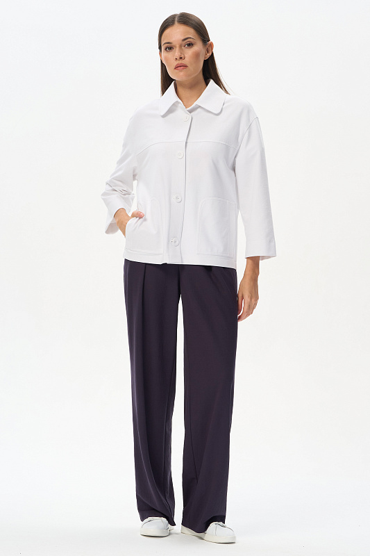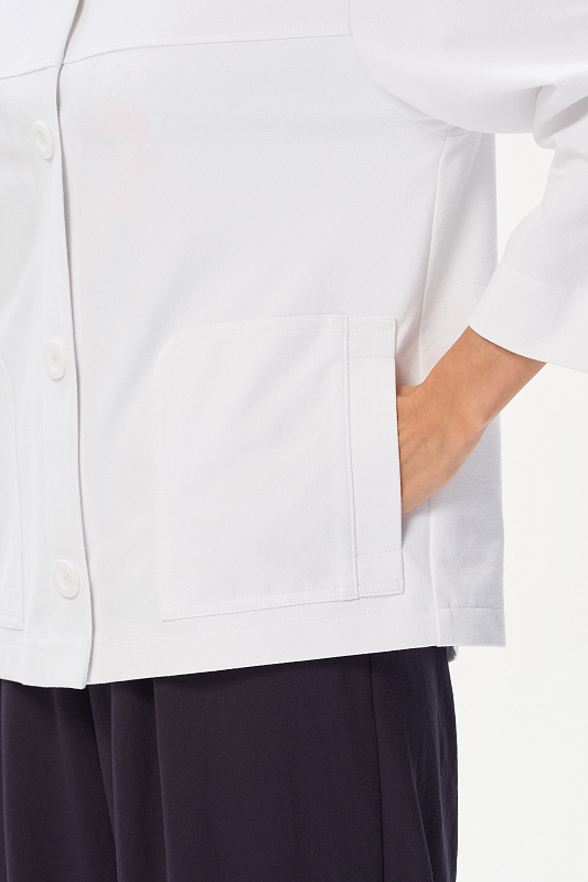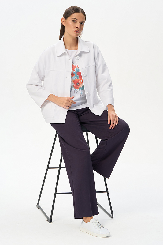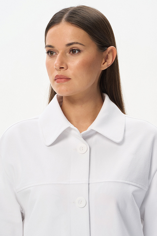Новая модель из джинскота 240 гр в чистом белом оттенке. Куртка прямого силуэта с воротником на стойке, застёжка на пуговицы, модные накладные карманы с боковым входом, втачные рукава длиной 7/8 с отворотом, с кокеткой по полочке и спинке. Идеальная модель для лета. Рост модели 175 см