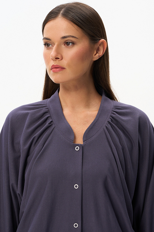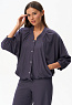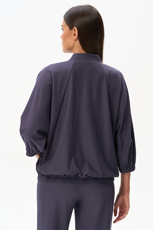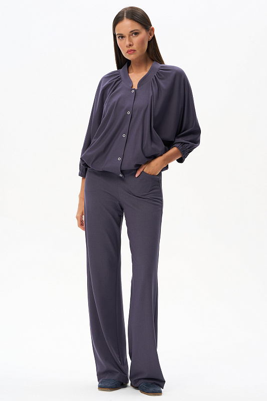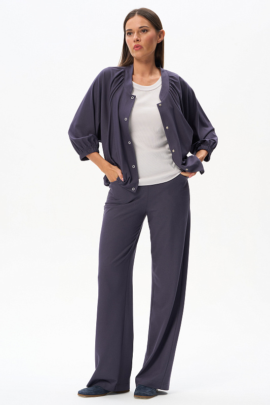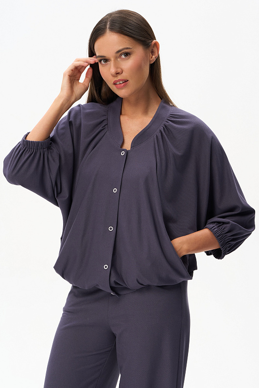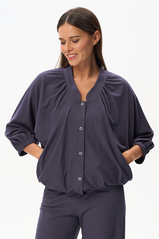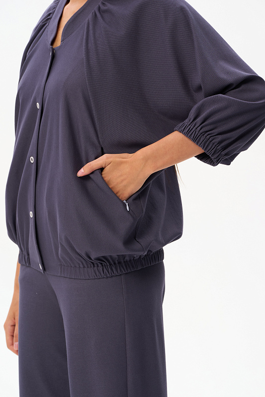 Короткий жакет-блузка выполнен из тонкого джинскотта 165 гр в трендовом оттенке Утренний туман. Рукава цельнокроеные укороченные на резинке, подвернув их, можно варьировать длину. На куртке диагональные рельефы с карманами на потайных молниях, модель застегивается на кнопки в тон. Рост модели 175 см