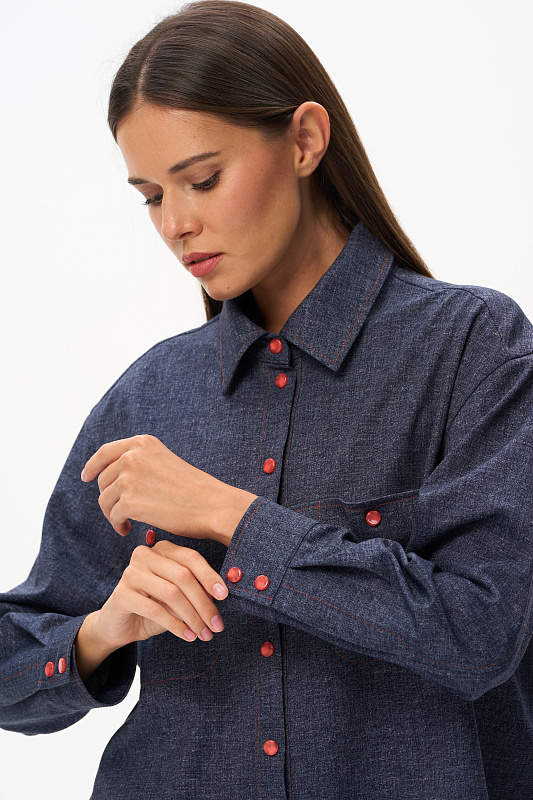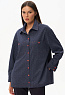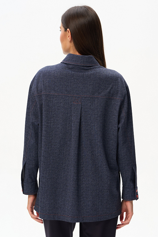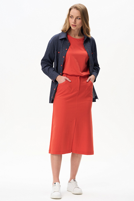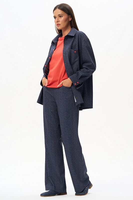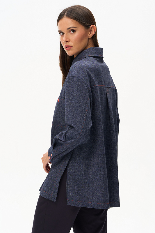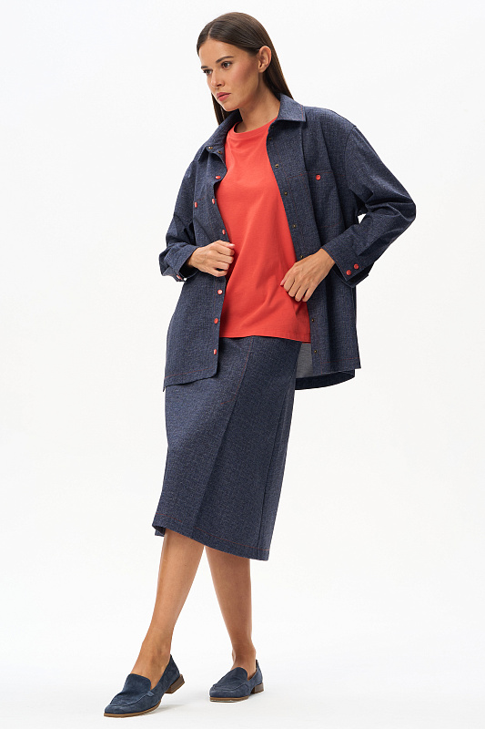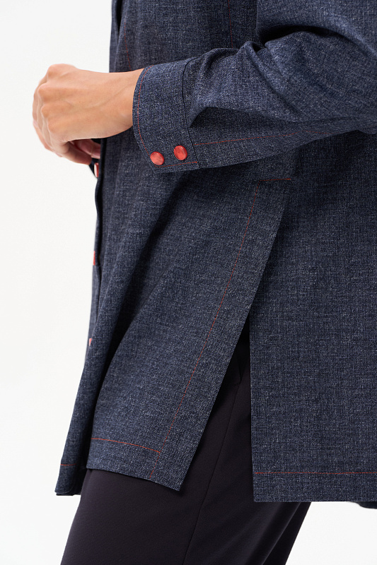 Куртка выполнена из двухстороннего жаккарда, чуть расширенная к низу, длина полностью закрывает бедра. Рукав со спущенной линией плеча и шлицей на кнопках. Разрез на рукаве позволяет его отвернуть и показать обратную сторону полотна. Воротник на стойке. На полочке – накладные карманы; в боковых швах – разрезы, открывающие свободный доступ к карманам брюк. Акцентом являются контрастная оранжевая отстрочка и кнопки того же цвета. Модель не мнется и удобна в носке. Рост модели 175 см.