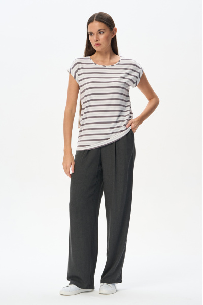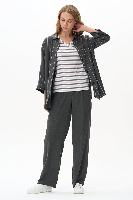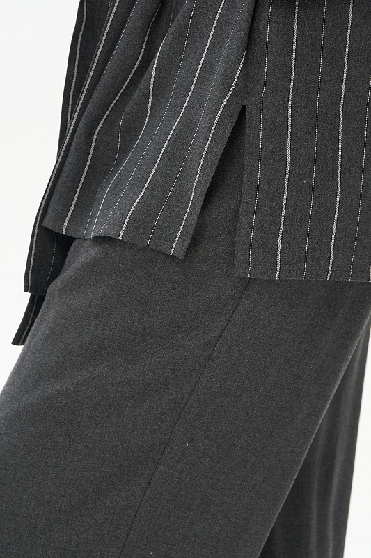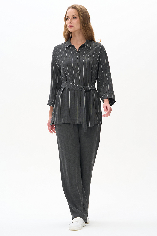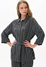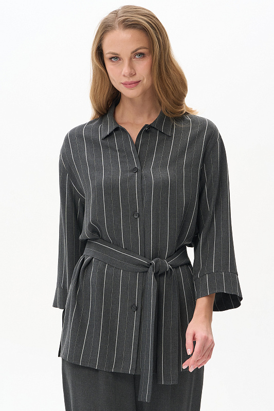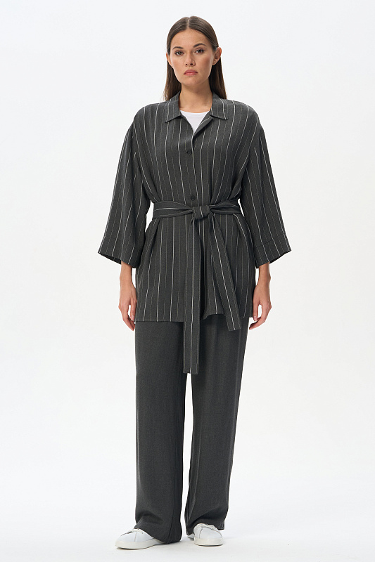 Жакет-рубашка из вискозной ткани 130 гр в оттенке Городской горизонт с тонкой вертикальной полоской. Модель с рубашечным воротником, рукава спущенные, манжеты с отворотом, застежка на маленькие пуговицы, по бокам разрезы. Для этой модели выбрана ткань, дизайн которой напоминает классическую шерсть. Благодаря этому модель незаменима в качестве офисного варианта для лета. Рост модели 175 см