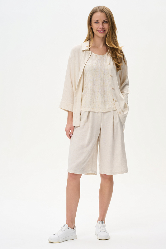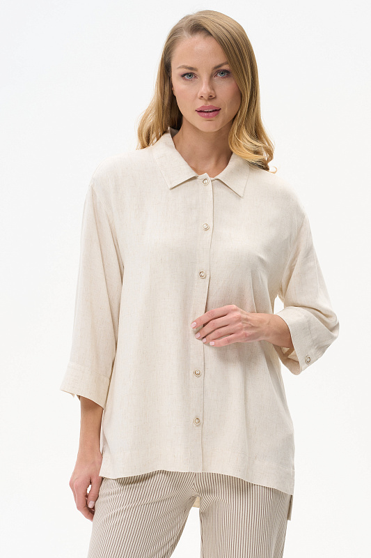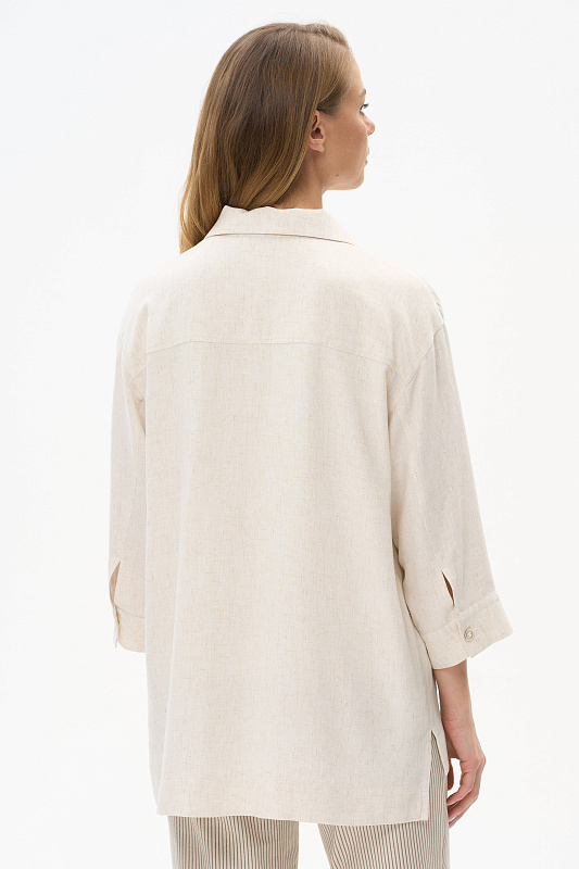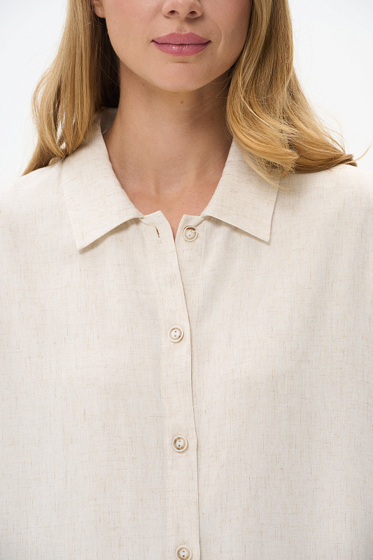 Жакет-рубашка из вискозной ткани с добавлением льна 138 гр в натуральном льняном оттенке. Модель свободная, отложной воротник, застежка на пуговицы, рукава длиной 7/8 с манжетами, по бокам разрезы. Жакет с разным уровнем длины спинки и полочки - трендовое решение для летнего сезона, идеально подходит для офиса, сочетается с большим количеством моделей коллекции и сезона вцелом. Рост модели 175 см.