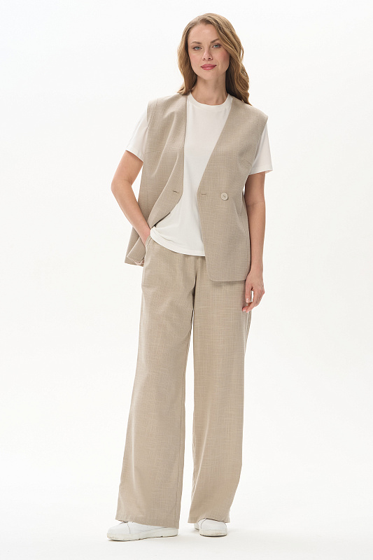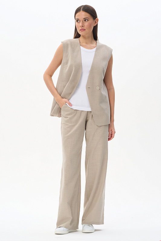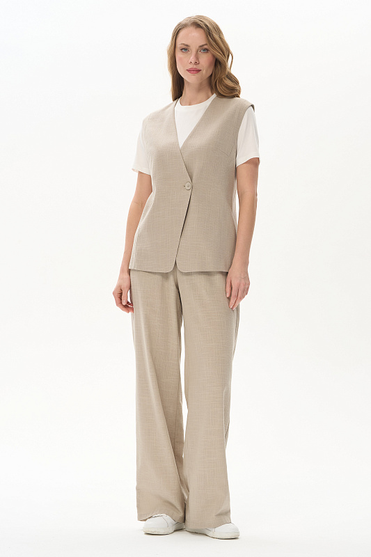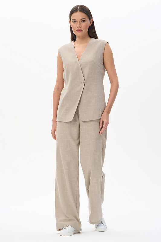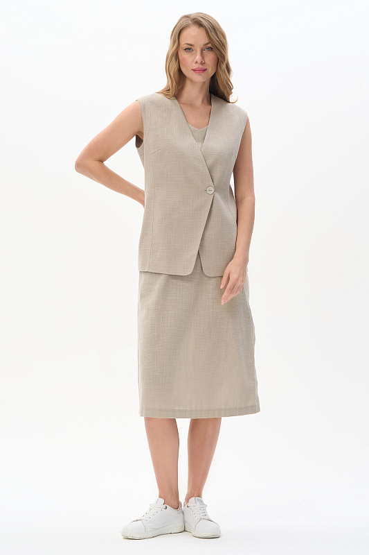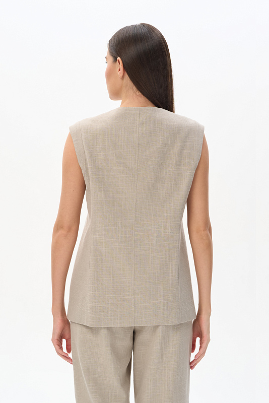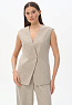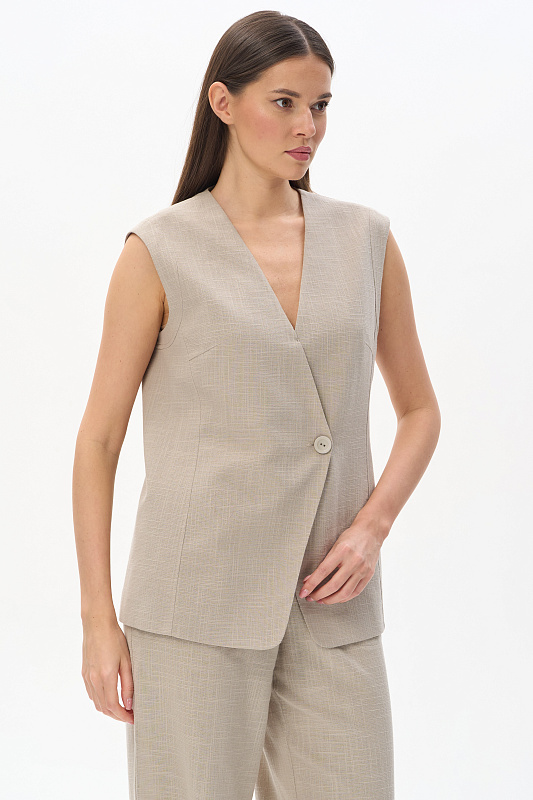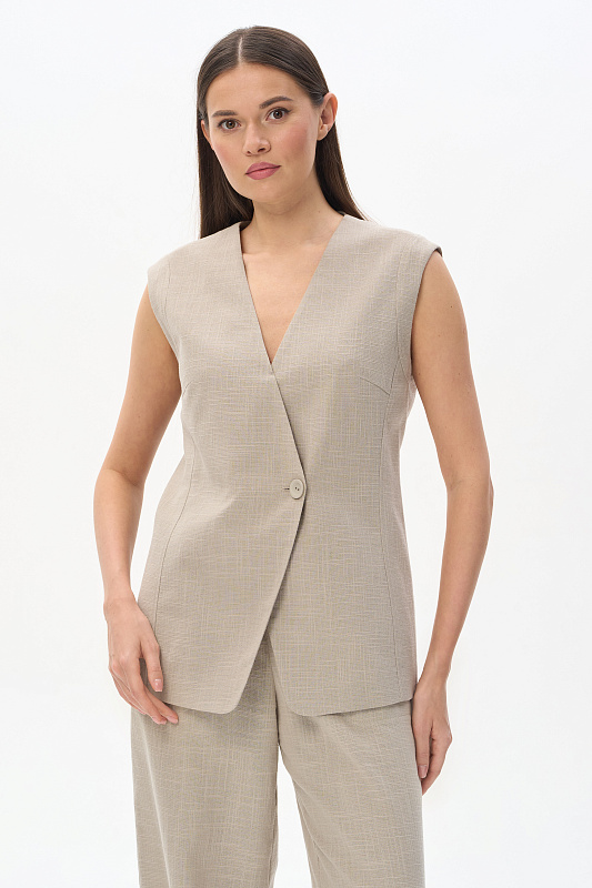 Модный жилет из хлопковой фактурной ткани 120 гр в серо-зелёном оттенке. Модель на тонкой подкладке, полуприлегающего силуэта, удлинённый, V-образный вырез, застёжка на пуговицу. Жилет с ассиметричный бортои - стильное дополнение к летнему гардеробу, для создания как повседневных, так и элегантных образов. Рост модели 175 см