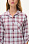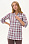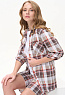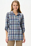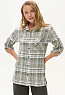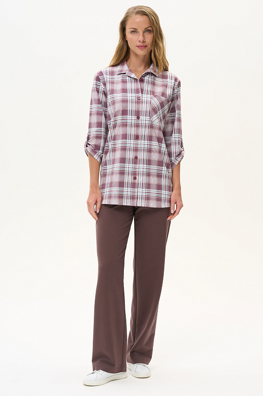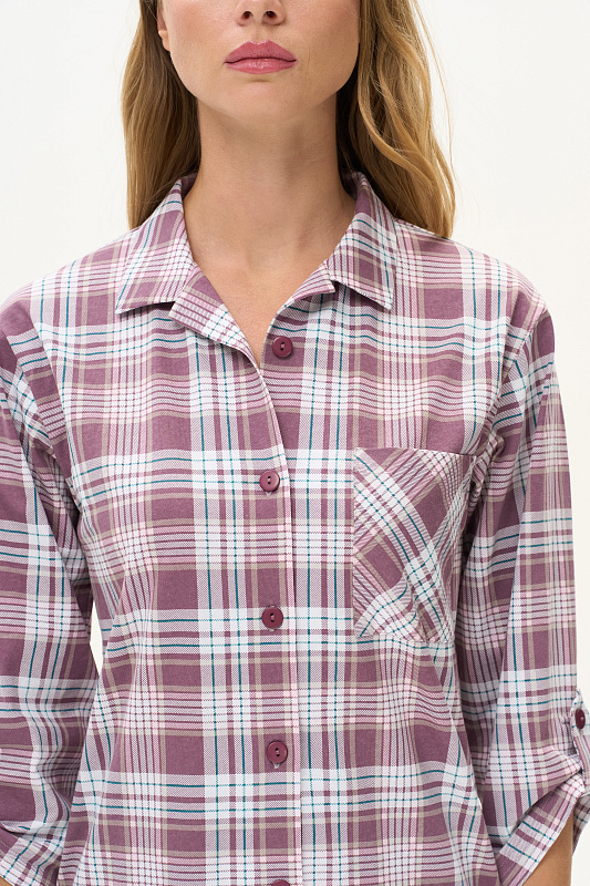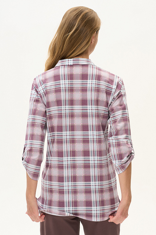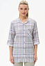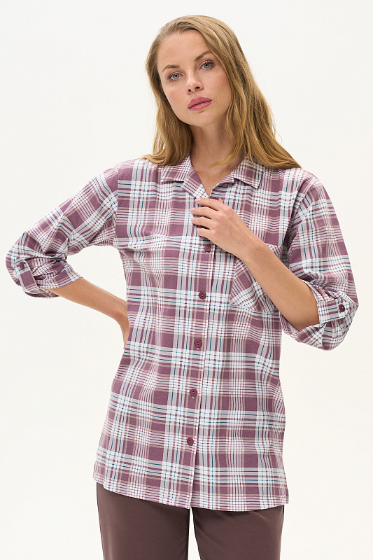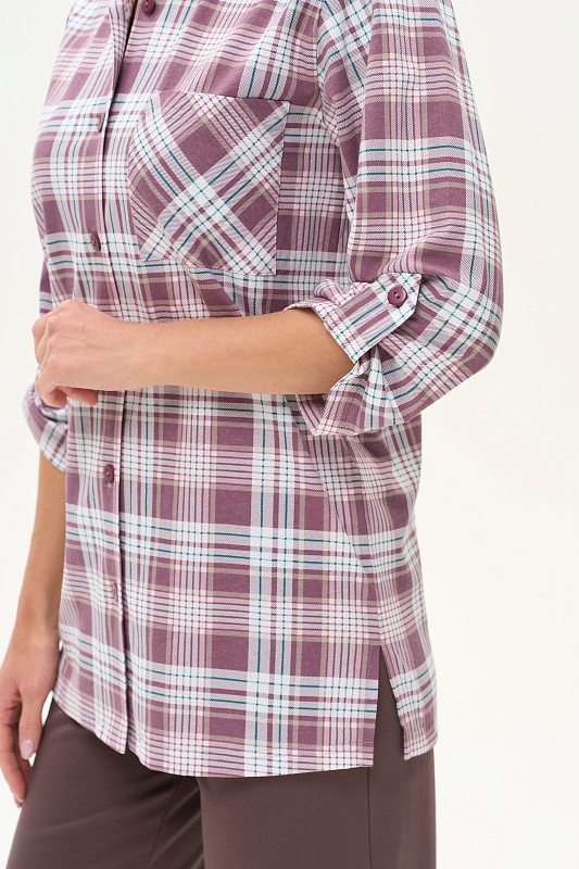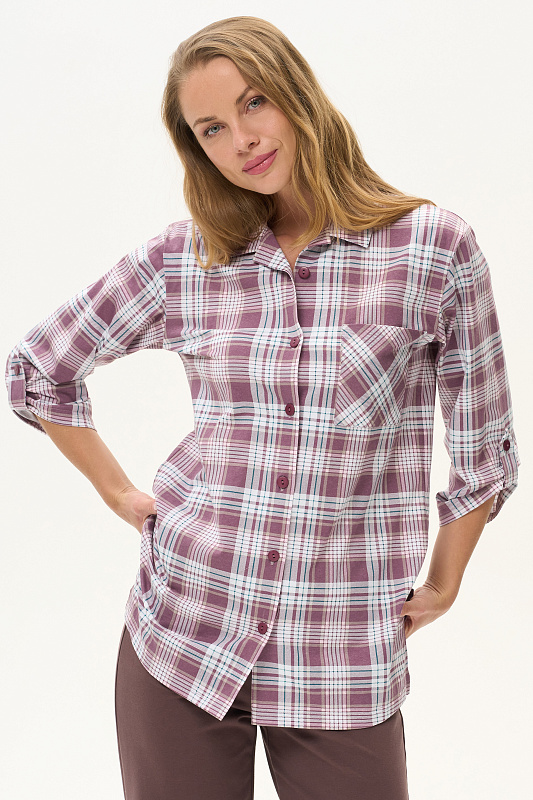 Рубашка прямого силуэта с отложным воротником из хлопкового полотна. Застежка на пуговицы. Накладной карман, по низу разрезы в боковых швах. Втачные рукава 3/4 с патами и пуговицами.Рост модели 175 см.
