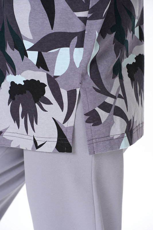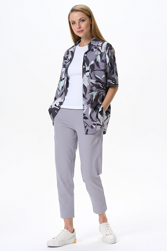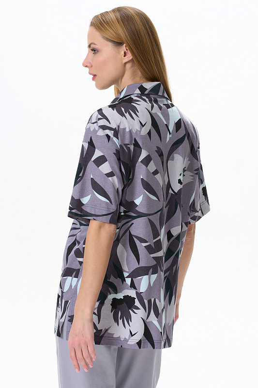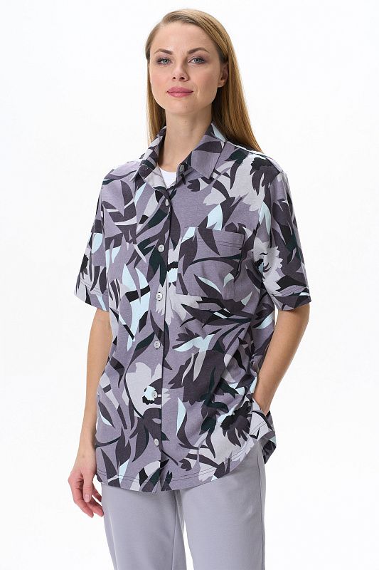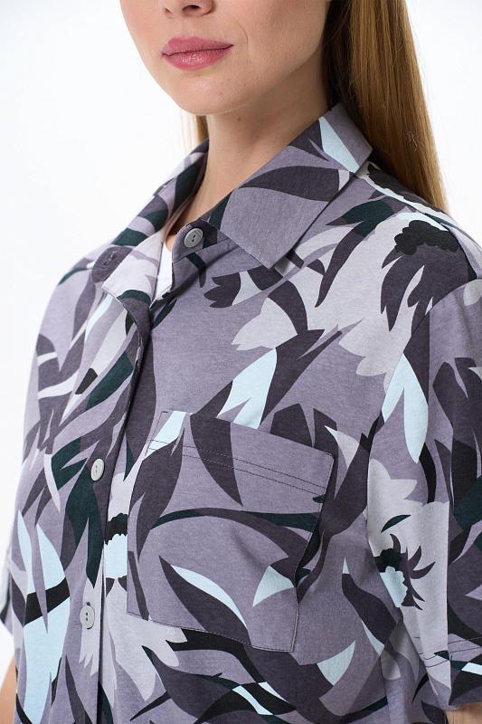 Свободная рубашка из хлопкового трикотажного полотна. Отложной воротник на стойке, застежка на пуговицы, накладной карман, короткие рукава. Рост модели на фото 170