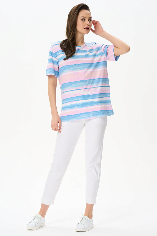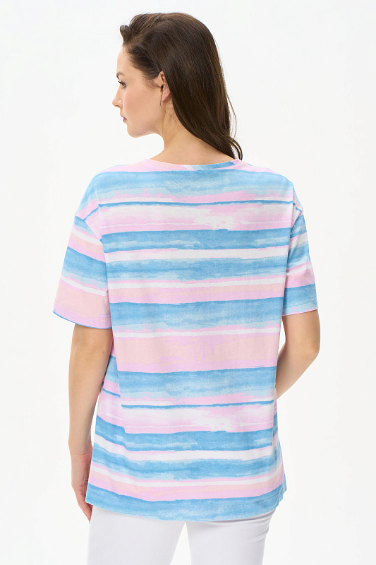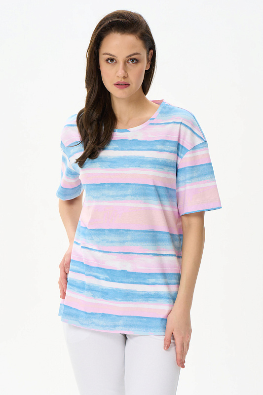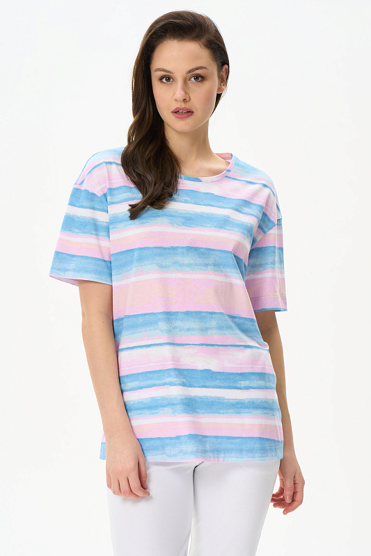 Удлиненная футболка свободного силуэта из хлопкового трикотажного полотна. Широкие рукава длиной до локтя. По низу изделия в боковых швах разрезы. Рост модели на фото 177