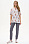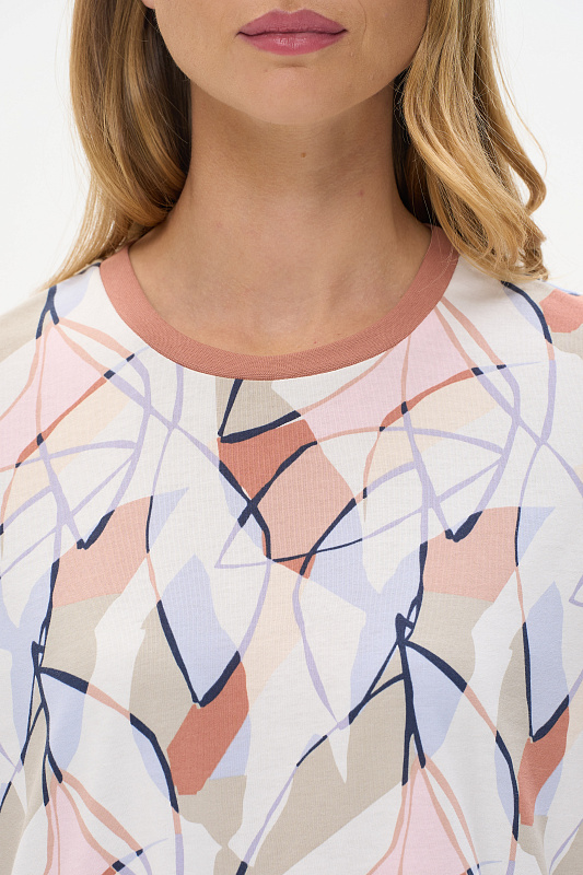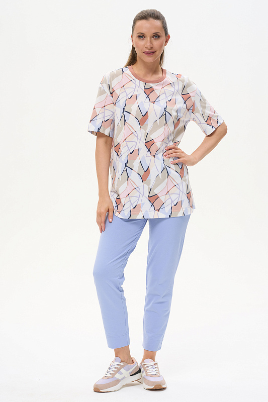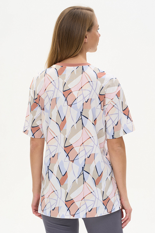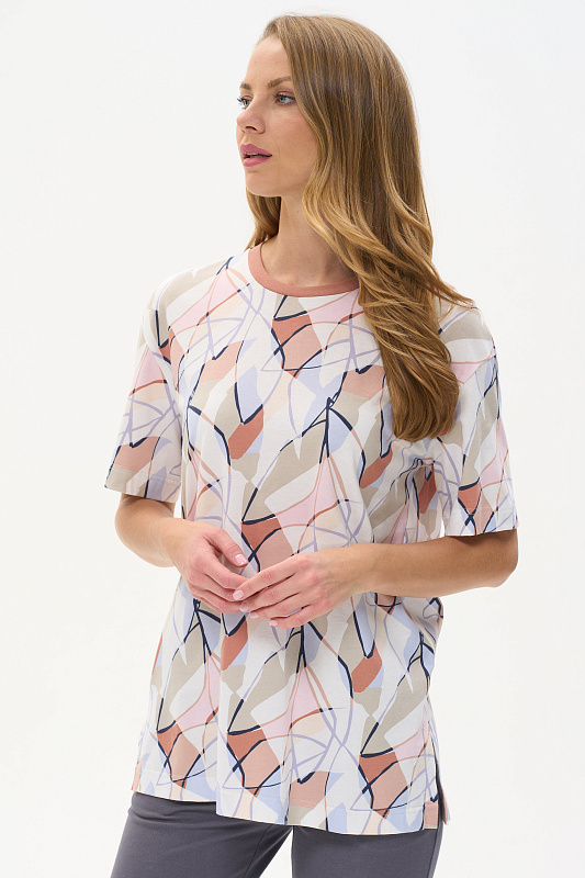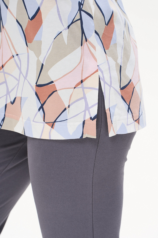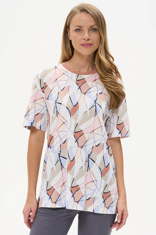 Удлиненная футболка свободного силуэта из хлопкового трикотажного полотна, качества пенье. Круглый вырез горловины окантован хлопковым полотном рибана, широкие рукава. По низу изделия в боковых швах разрезы. Рост модели на фото 178 см.