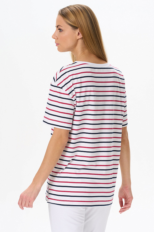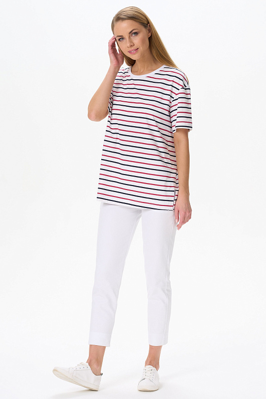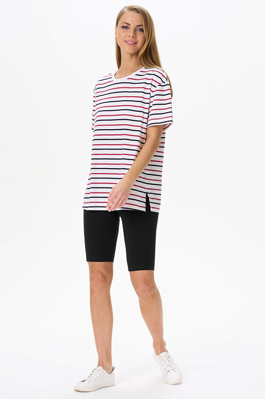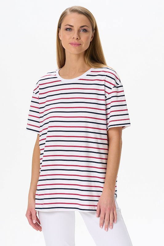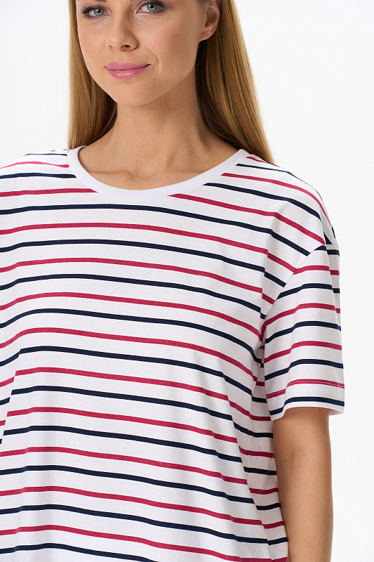 Повседневная базовая футболка из кулирки 150 гр. в сине-красную полоску. Модель свободная, удлинённая, круглый вырез горловины обработан рибаной, рукава широкие, длиной до локтя, по бокам разрезы. Очень комфортная, универсальная модель в классических сине-красных оттенках. Эффектная полоска идеальна для жаркого лета, и актуальна в любой сезон. Рост модели 175 см.