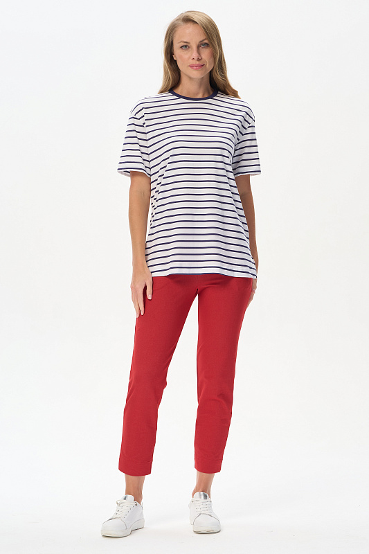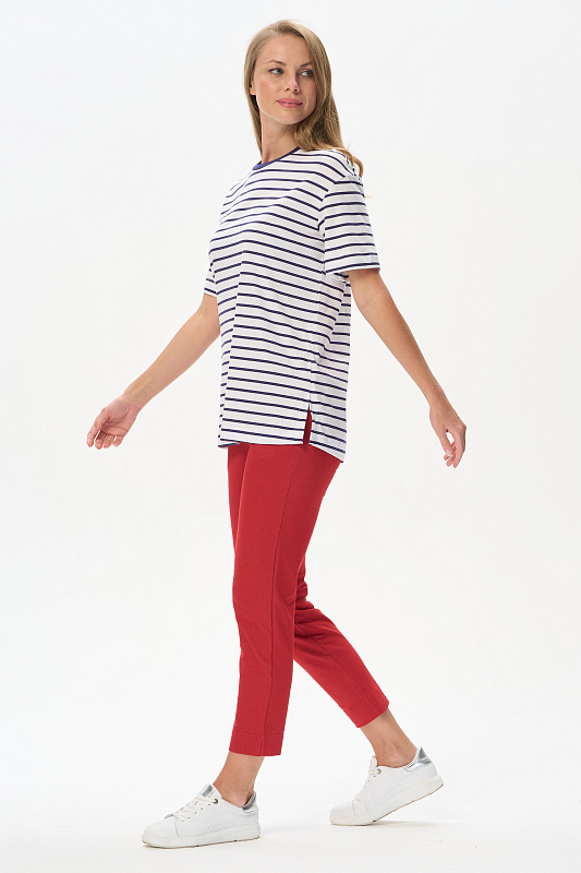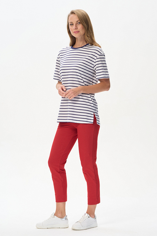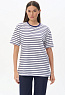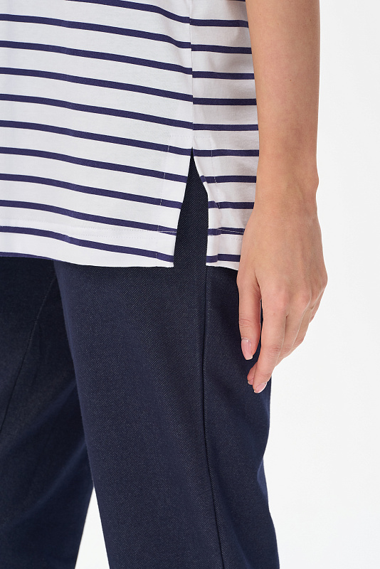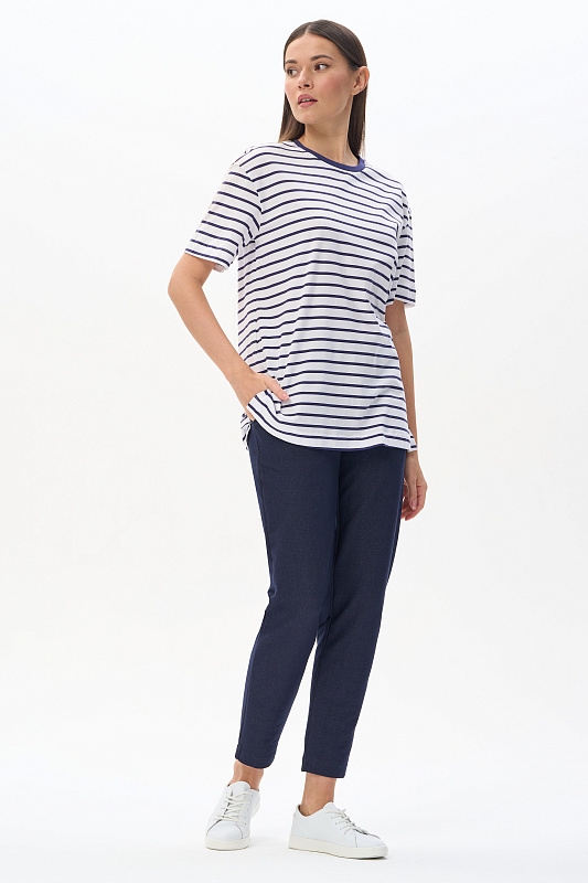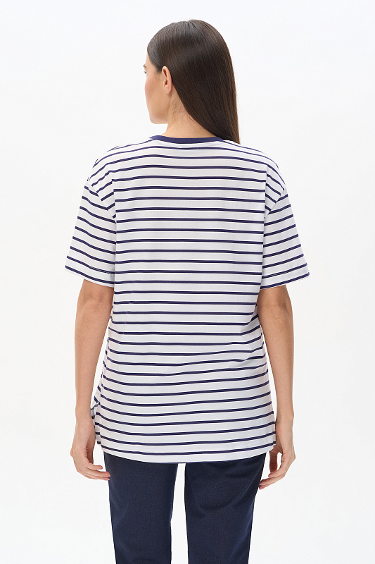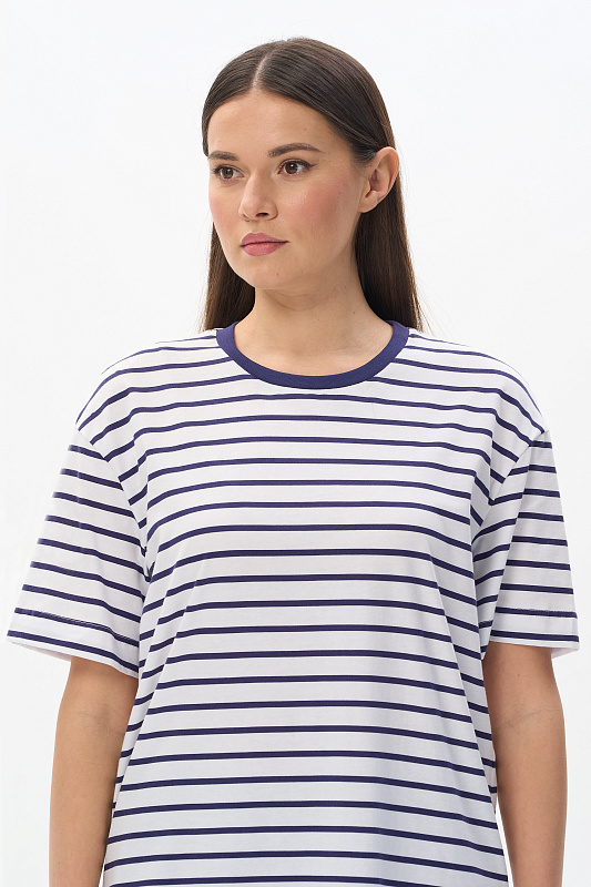 Повседневная базовая футболка из кулирки 150 гр. в сине-белую полоску. Модель свободная, удлинённая, круглый вырез горловины обработан рибаной, рукава широкие, длиной до локтя, по бокам разрезы. Очень комфортная, универсальная модель в классических сине-белых оттенках. Эффектная полоска идеальна для жаркого лета, и актуальна в любой сезон. Рост модели 175 см.