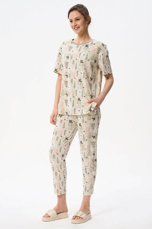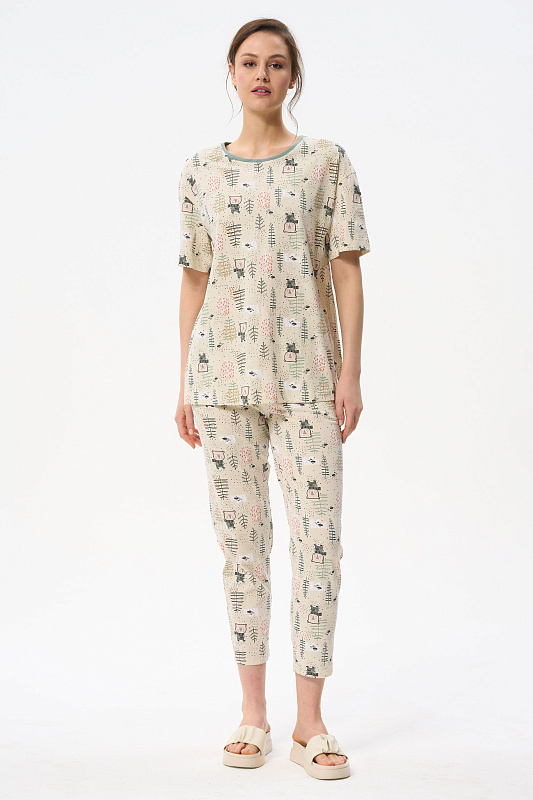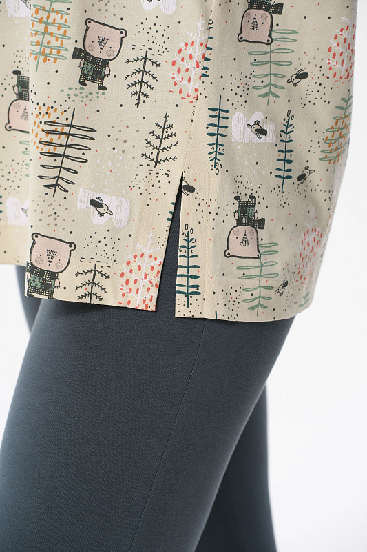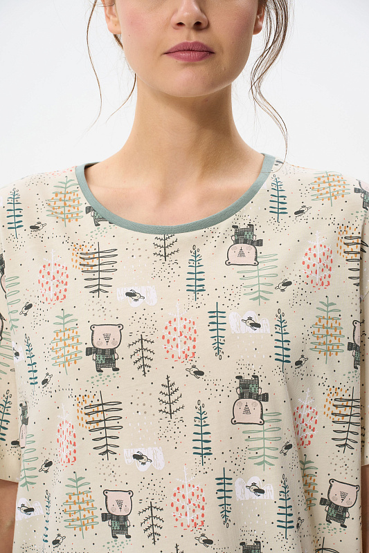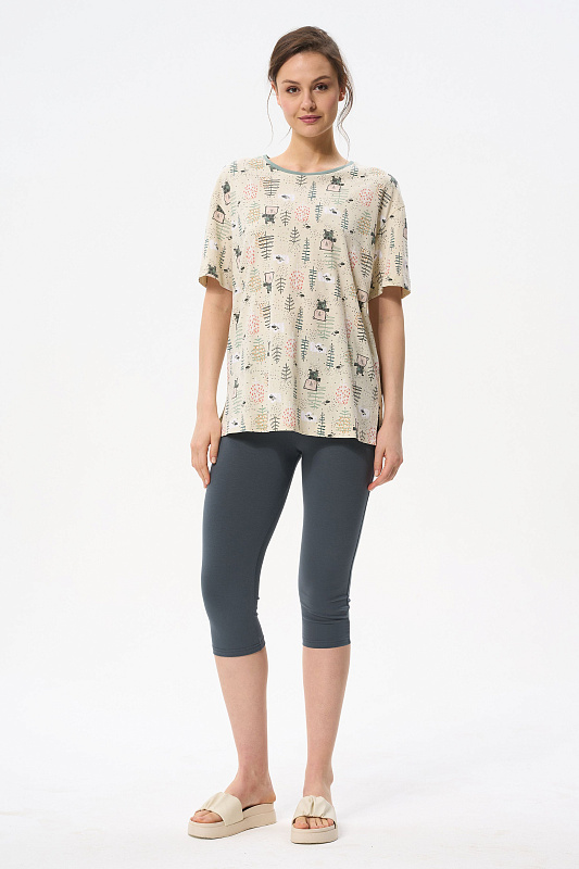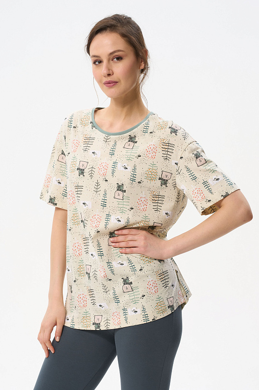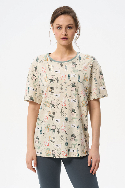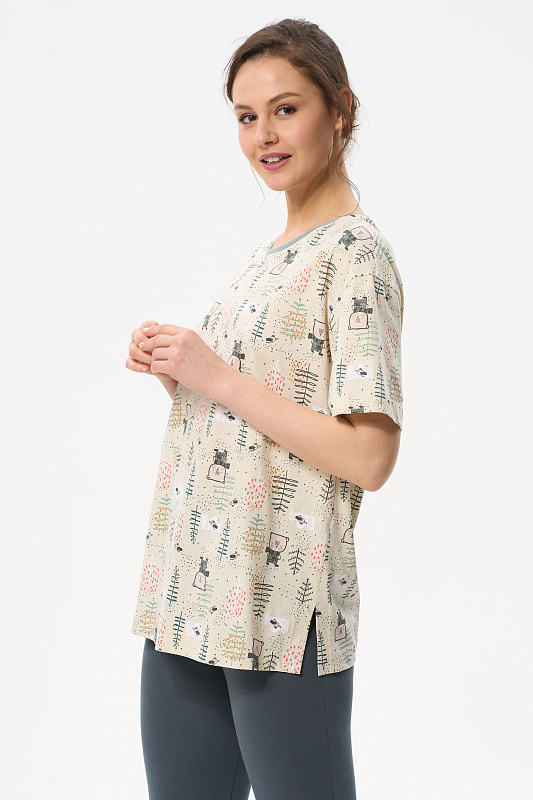 Футболка с принтом свободного силуэта из хлопкового полотна. Круглый вырез горловины обработан рибаной, широкие рукава. По низу изделия в боковых швах разрезы. Рост модели на фото 178 см.