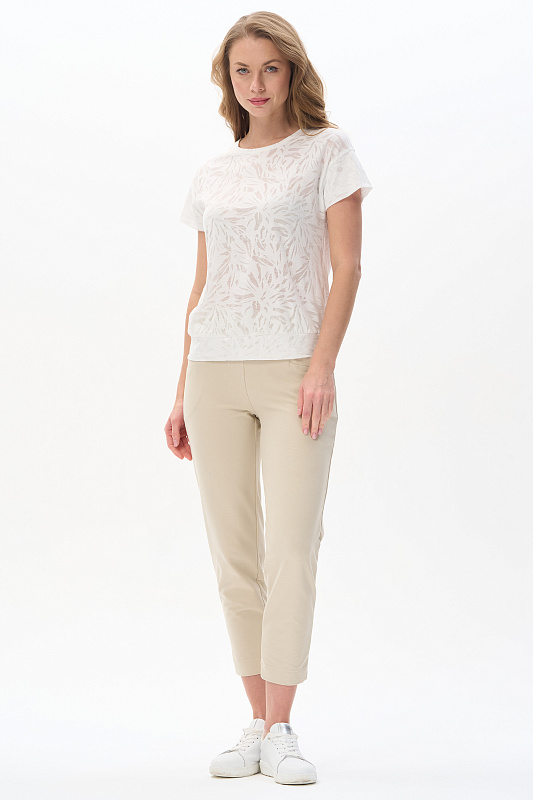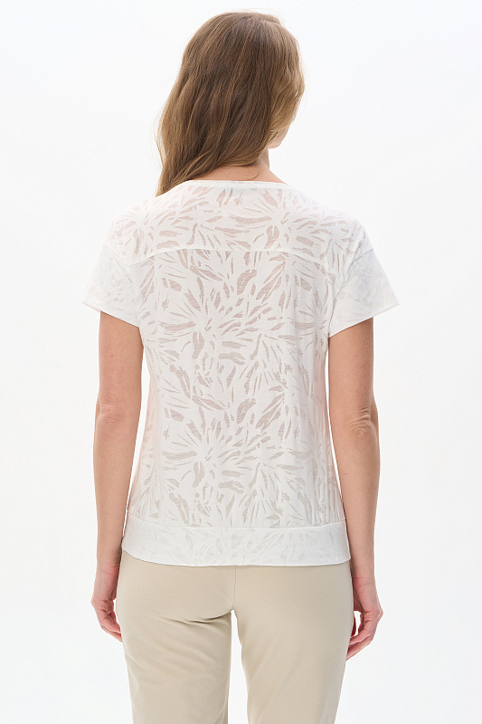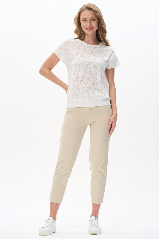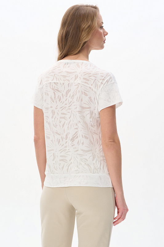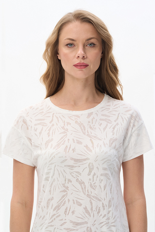 Блузка из полотна деворе 130 гр с эффектом прозрачности в молочном оттенке. Модель со спущенной линией плеча, короткие рукава, круглый вырез горловины, широкая планка по низу изделия для комфортной посадки. Идеально сочетается со всеми брюками и юбками коллекции. Эффект полупрозрачности добавляет нотку изысканности. Отличный вариант для создания стильных летних образов. Рост модели 175 см.