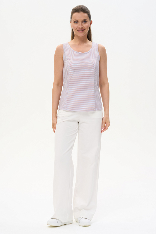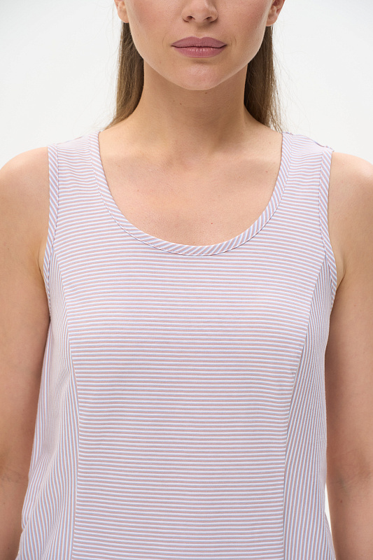 Майка из хлопкового трикотажного полотна. Круглый вырез горловины и проймы окантованы, рельефные швы. Рост модели на фото 175 см.