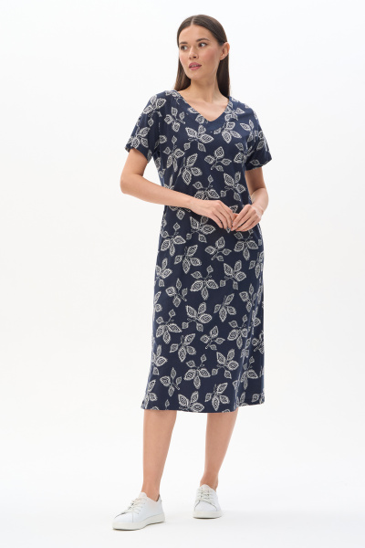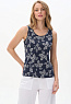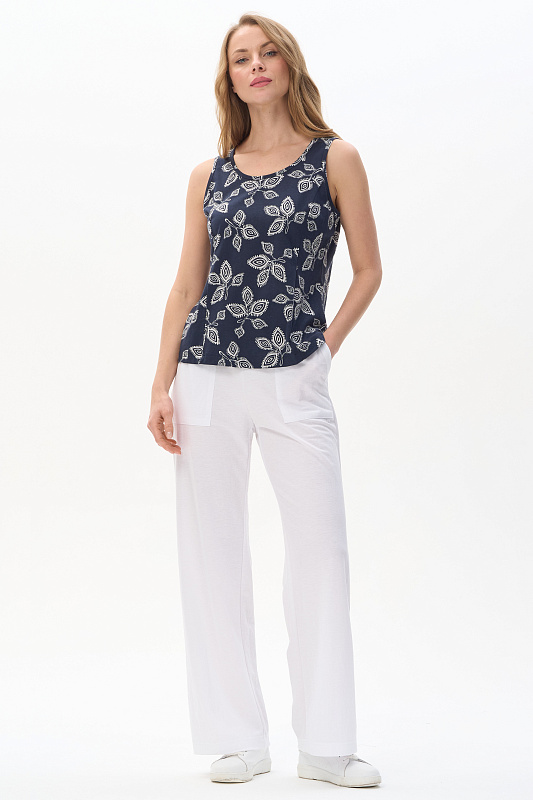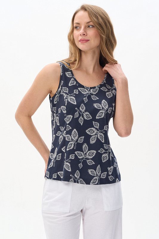 Майка из кулирки качества ПЕ 150 гр Светло-серая графика на глубоком синем. Модель с рельефами, круглый вырез горловины и проймы обработаны тонкой бейкой. Удобная модель для создания многослойных образов. Рост модели 175 см.
