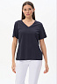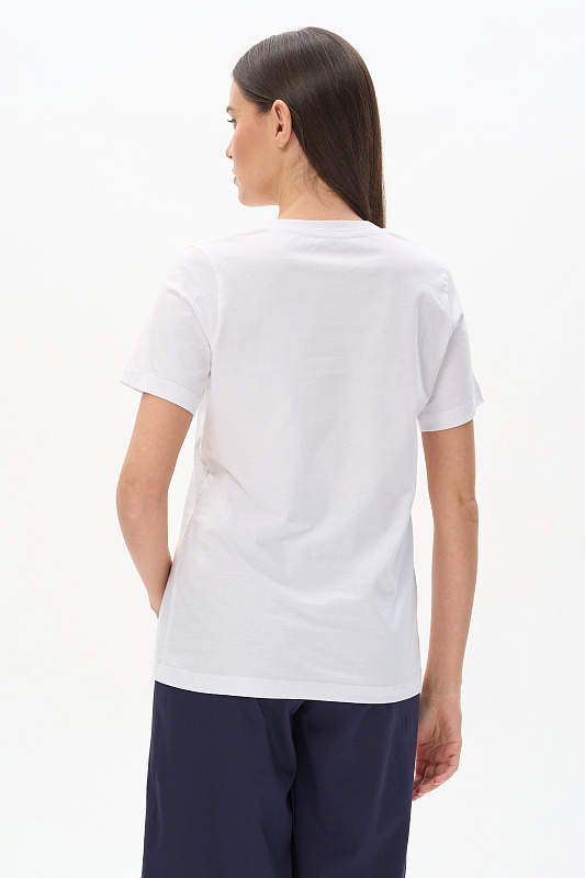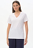 Футболка выполнена из хлопкового полотна. V-образный вырез горловины, короткие рукава. Рост модели на фото 175.