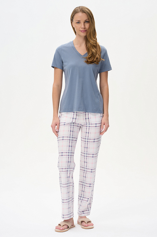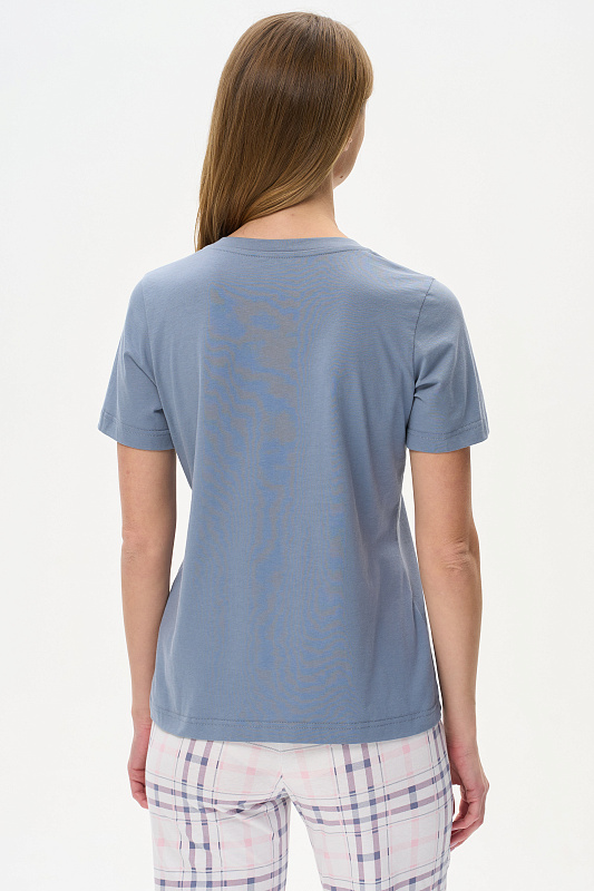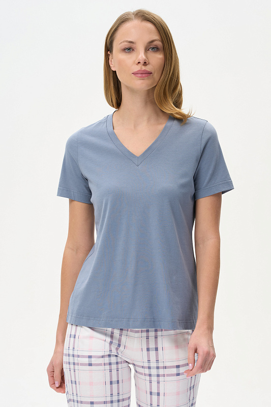 Футболка выполнена из хлопкового полотна. V-образный вырез горловины, короткие рукава. Рост модели на фото 175 см