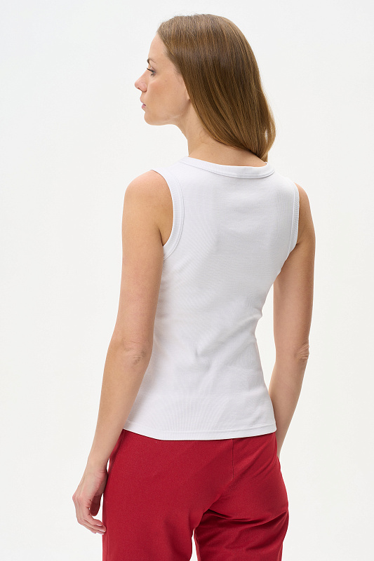 Топ выполнен из хлопкового трикотажного полотна с эластаном - кашкорсе. Модного прилегающего силуэта. Круглый вырез горловины и завышенные проймы обработаны широкой планкой. Рост модели на фото 178см.